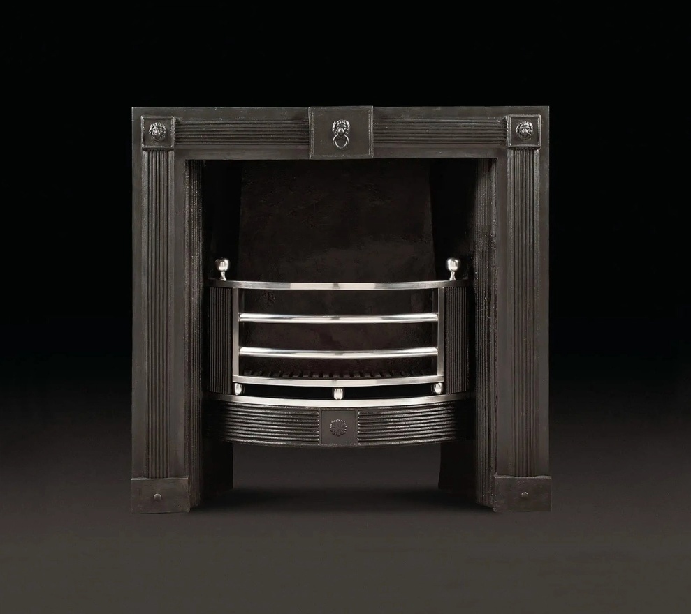 A cast iron and polished steel register grate of Regency design, the jambs and frieze reeded and decorated with lion masks, the curved fire basket with polished steel fire bars and finials and a reeded apron.