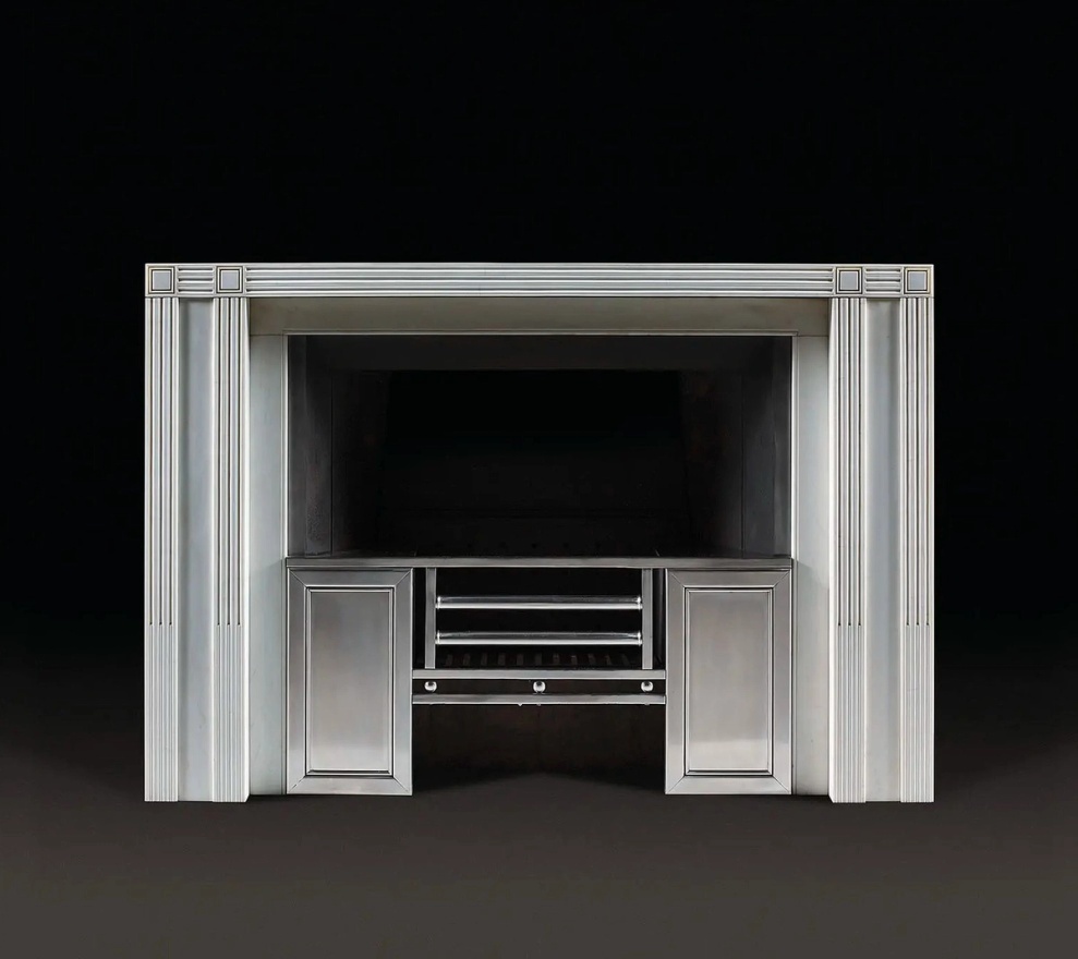 A polished steel hob grate designed by Sir John Soane of strong architectural form. The uprights with inset fielded panels enclosing the fire basket with rounded fire bars and balls.