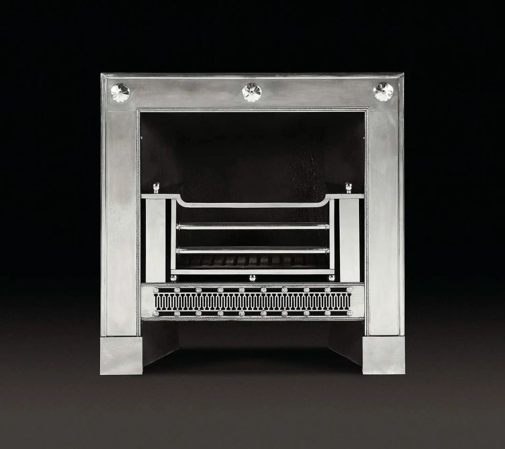 A cast iron and steel register grate of early 19th century design. The frieze and jambs enclosed with bands of running pearl and decorated with circular paterae. The basket above a band of pierced fret.