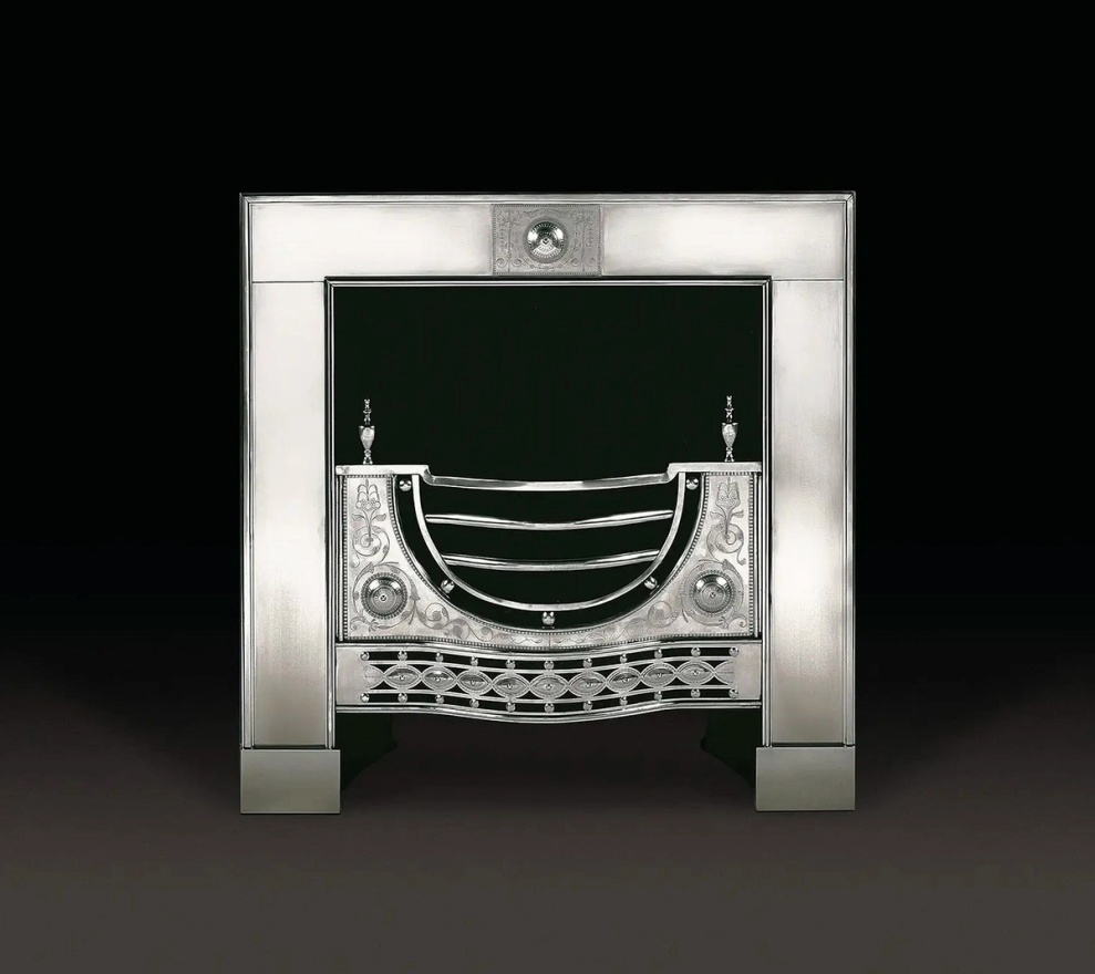 A magnificent example of a large, imposing, burnished steel register grate with a wealth of Adam decoration. The basket and apron are engraved with paterae, scrolling foliage and stylised anthemions, balanced by classical urns.