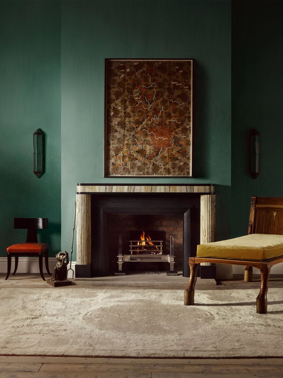 An Art Deco style chimneypiece carved in Black Marble and specimen Onyx with tones of yellow and green. The landscape orientation of this design is borrowed from Soanian modernity 100 years prior. The playful and overscale proportion is evocative of the broad curved silhouette so characteristic of numerous Art Deco buildings in London, New York and Miami. The imposing reeded pilaster jambs support a linear shelf, expressing a sense of modern age aesthetic.
