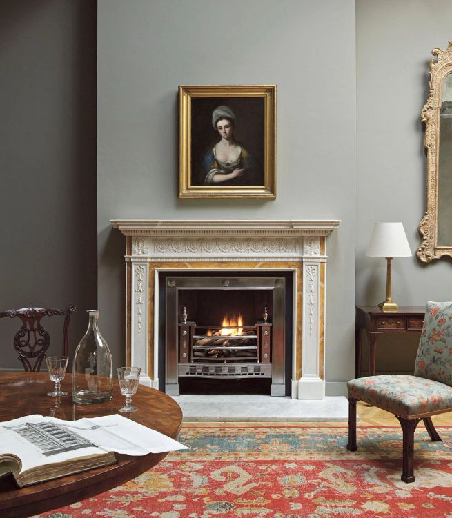Flora, the goddess of flowers, is the theme of this mantelpiece, of late 18th century Neo-classical design. The elegant moulded tiered shelf with dentil decoration, the frieze beautifully carved with a continuous band of foliate swags of flowers upheld by ribbons and centred with flower decorated paterae. The pilaster jambs are decorated with tied ribbons from which fall inverted flowers, the corner blocks with Honeysuckle flowers. The white marble offset by the warm sienna on the in grounds and out grounds.