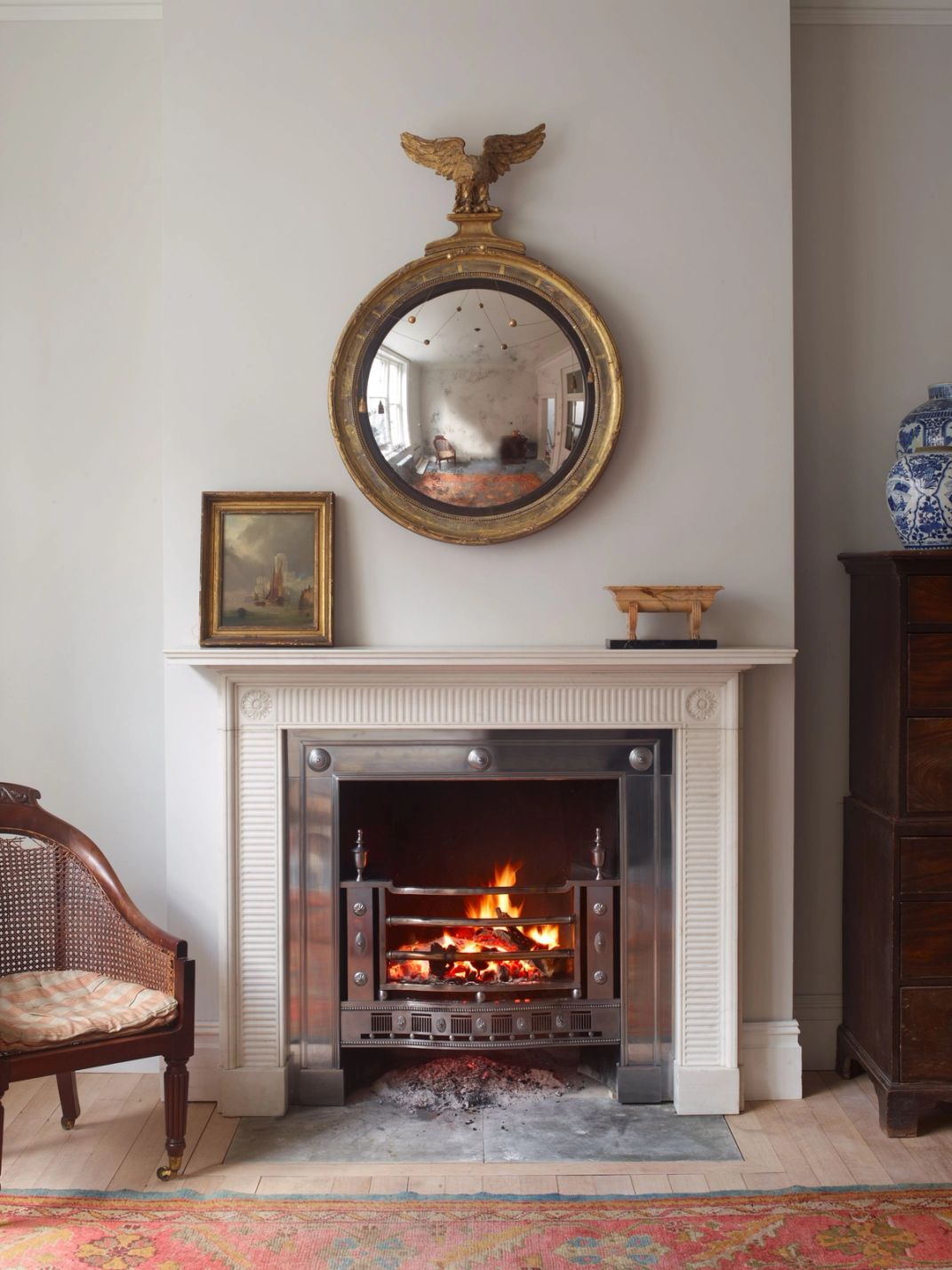 A contrasting interplay of light and shadow is created by the simple but effective geometric design of finger flutes which decorate the frieze and jambs on this decorative white marble chimneypiece. It is further enhanced by the finely sculpted circular paterae.