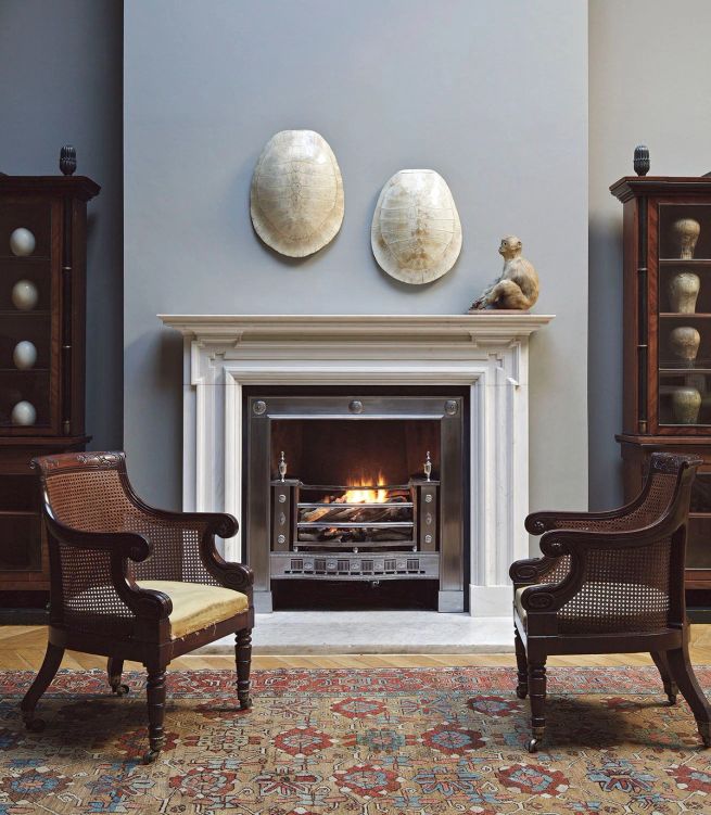 This white marble fireplace of strong architectural form is after a design by Sir John Soane (1753–1837), who had adapted an earlier design of Inigo Jones. The rectangular moulded shelf above a plain heavily and deeply moulded frieze with a geometric design continuing down the jambs. The original antique chimneypiece was at the Bank of England.
