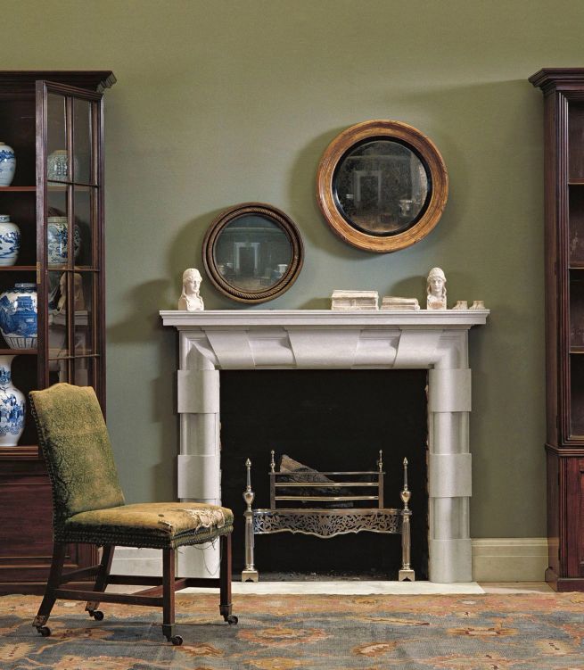 Strongly architectural in form, this fireplace is carved from Portland stone. Based on the designs of the English ornamental designer Batty Langley (1696–1751), bold, rusticated ‘quoins’ have been used to reinforce the strength of the design. The word quoin derives from the French for corner.