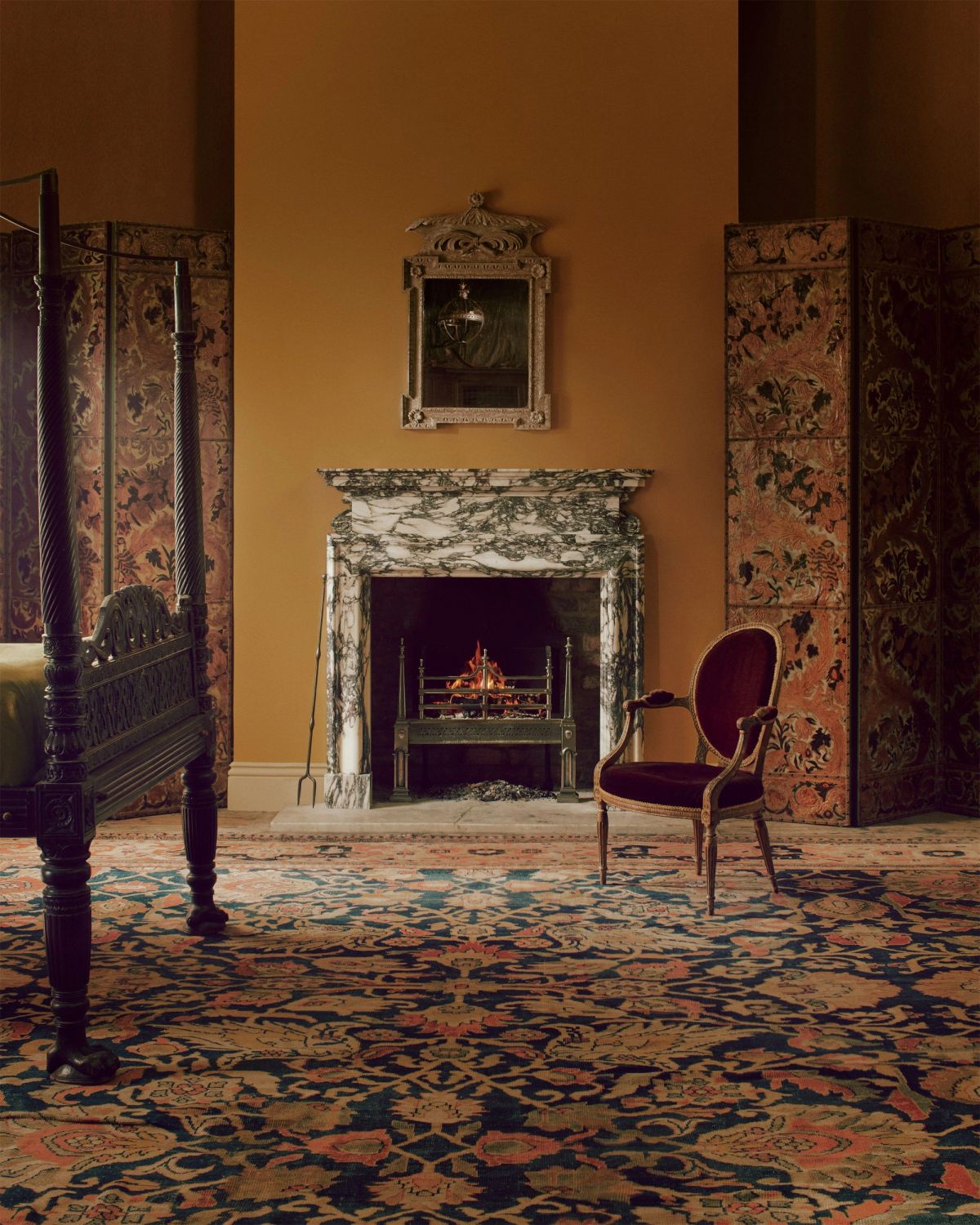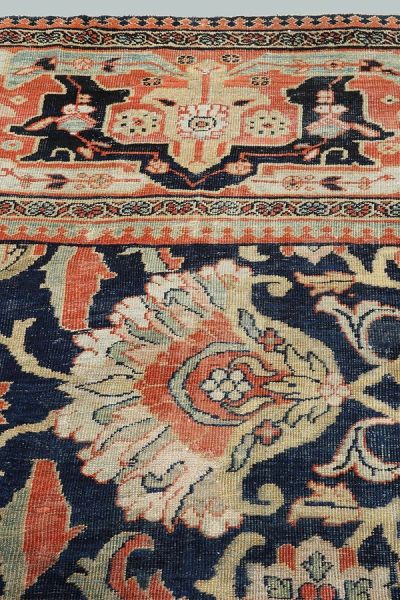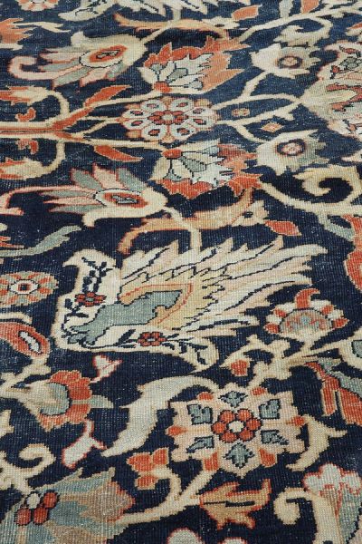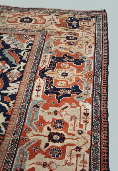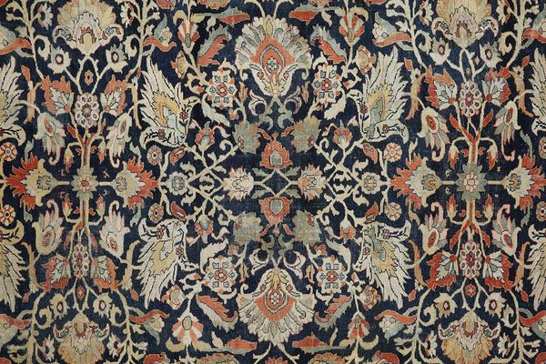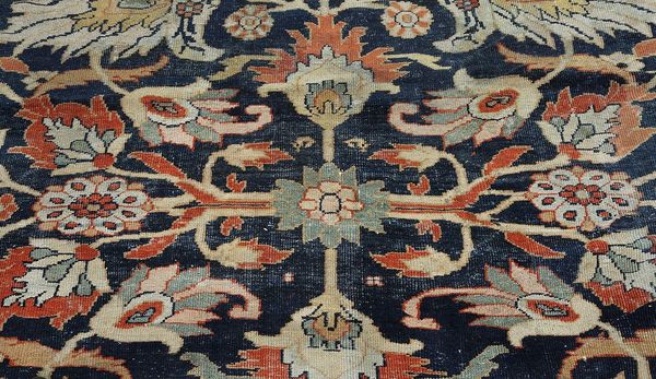 Magnificent deep navy field, with palmette design in jades, saffron, ochres and fawn lying within a border displaying miniature foliage and flowers in an intricate, linear style. This oversized carpet is in generally excellent condition and reveals only the appealing patina redolent of a gentle ageing process.
