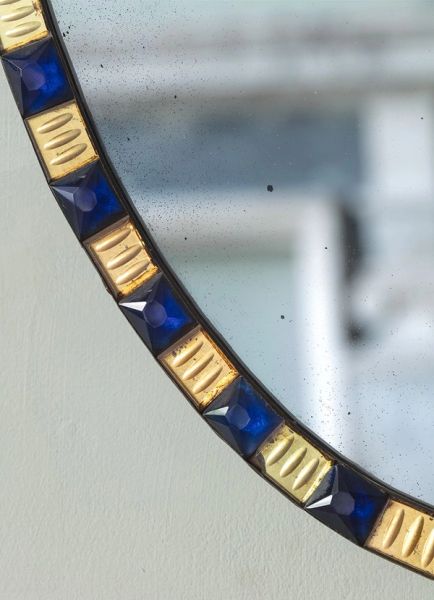 The oval mercury mirror plate (later replacement), with faceted cobalt blue glass frame, alternating with unusually wholly gilt and shaped studs.