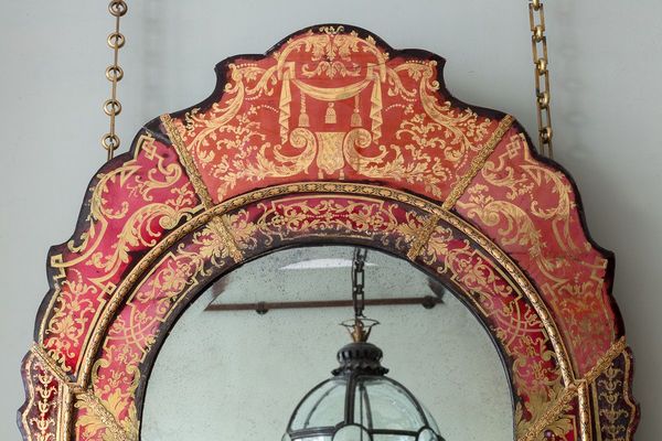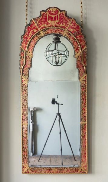 This richer, and more expensive technique was developed in France and became popular in the great English and Irish Estates of the late 17th, early 18th Centuries. ‘Verre Eglomisé’, developed by a ‘Monsieur Glom’ (more formally known as the Parisian dealer, framer and restorer Jean-Baptiste Glomy (1711-1786)), was a technique consisting of decorating glasswork from behind, into which designs are then engraved, and then adding coloured foil and pigments – most frequently red or black – but shades of blue and green were also used. Here a lustrous scarlet red is used, providing the frames of mirrors with a rich, colourful and glittering appearance – oft seen by candlelight, they became irresistible to the royal and noble audiences, as the coruscating candlelight flickered in the evening dusk. Few of these grand pieces have survived, and their hairline ‘cracks’, repairs, and flaws in the marginal plates make them all the more untouched and appealing with this in mind; some wonderful examples are to be seen at Hampton Court Palace, Chatsworth, Penshurst Place, and in other private collections.