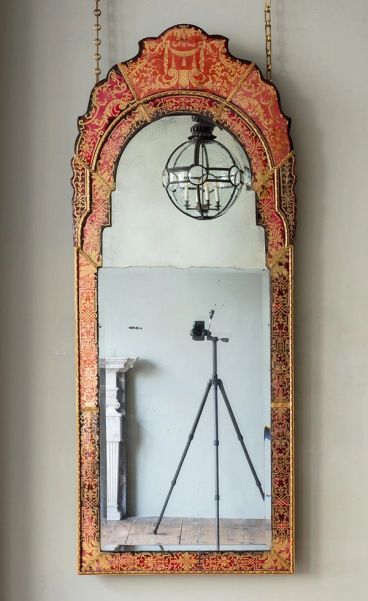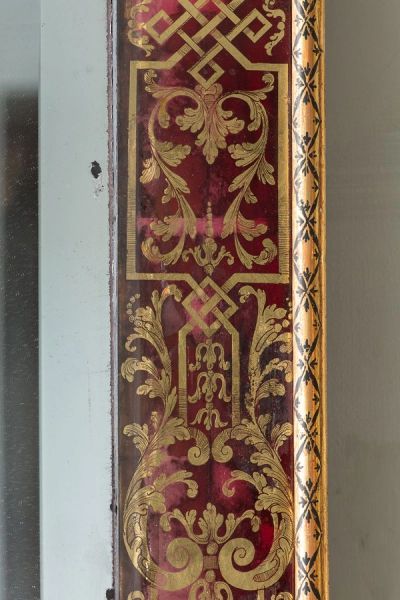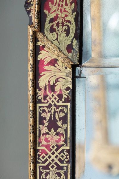 The provenance for these superb pair of pier glasses, lies with the great furniture dealer firm of Mallett’s; here you can see that all the panels of red eglomise are richly decorated with gilded motifs, reminiscent of Daniel Marot (1661-1752).