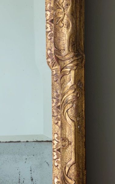 This slender proportioned mirror with exceptional carved and cut gesso work, incorporating flanking eagle heads and scrolling acanthus leaves, enclosing an elaborate monogram, possibly that of Frederick Louis, Prince of Wales (son of George II), for Leicester House.
