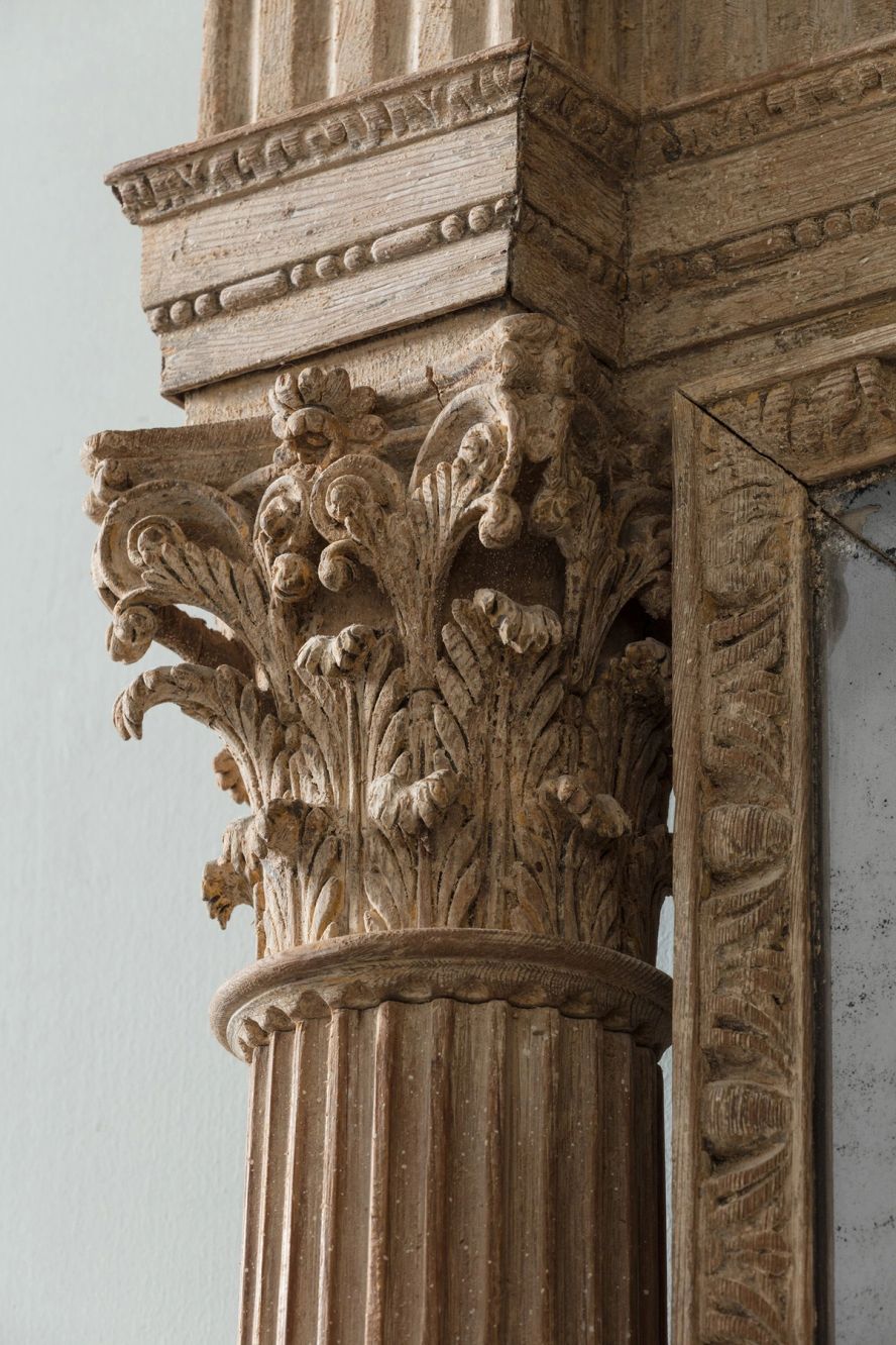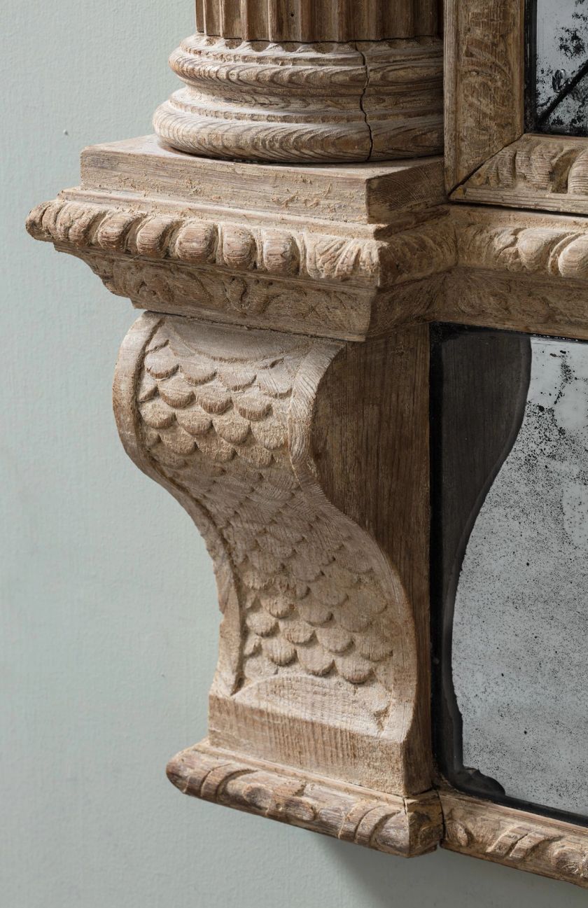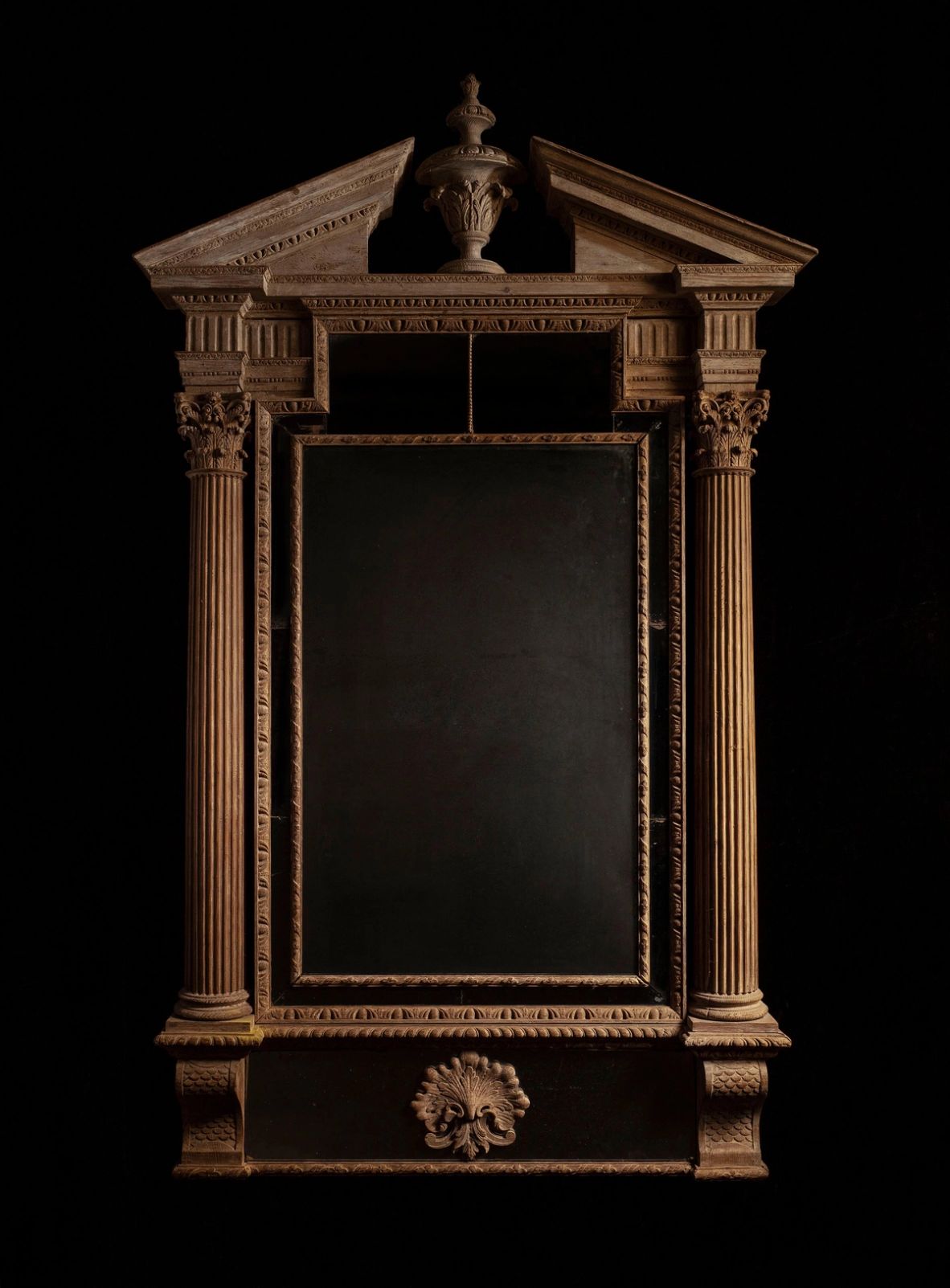 Surmounted by a triangular broken arch pediment centred by an urn above a dentil cornice and fluted frieze, the marginal plates within two bold tapering fluted columns with Corinthian capitals, the lower frieze with central leaf clasp, flanked by inbicrated corbels – Irish c.1775.