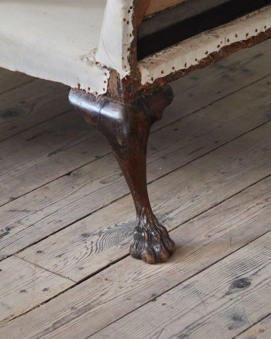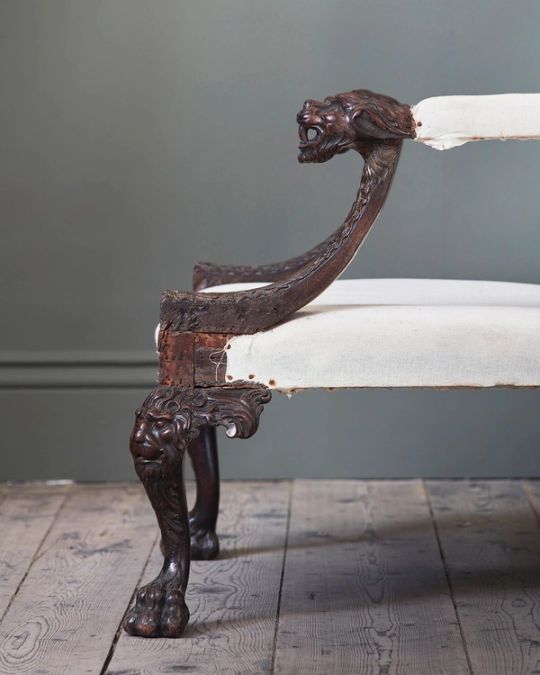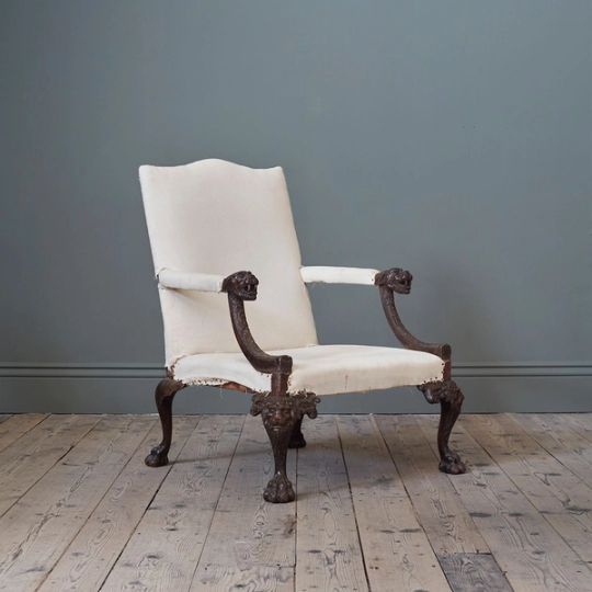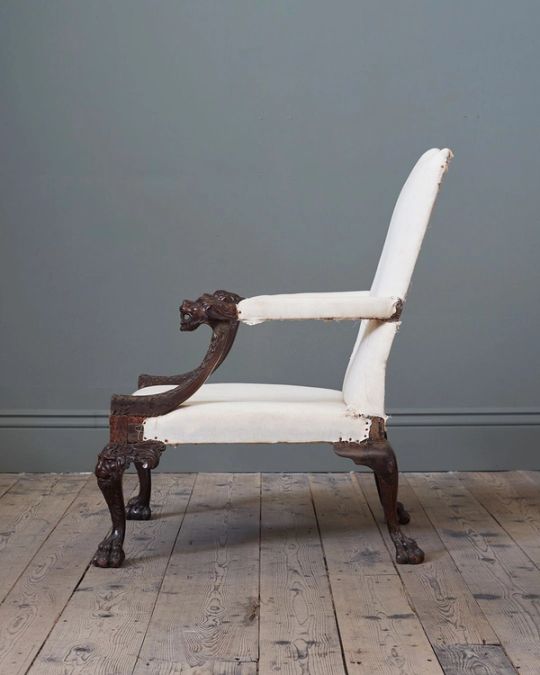 A mid 18th Century mahogany Gainsborough chair, of broad and low proportions, with shaped stop rail and magnificently carved arms depicting sabre-toothed beasts, with carved lion masks to the robustly shaped leg, terminating in hair paw feet. The back leg of particular note, adding a sculptural stance and emphasised rake, with overall dry and gentle surface patina. Upholstered to calico covering, for further upholstery on request.