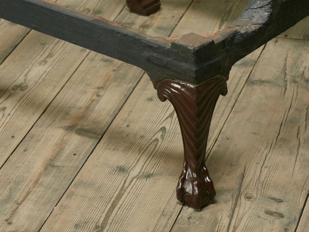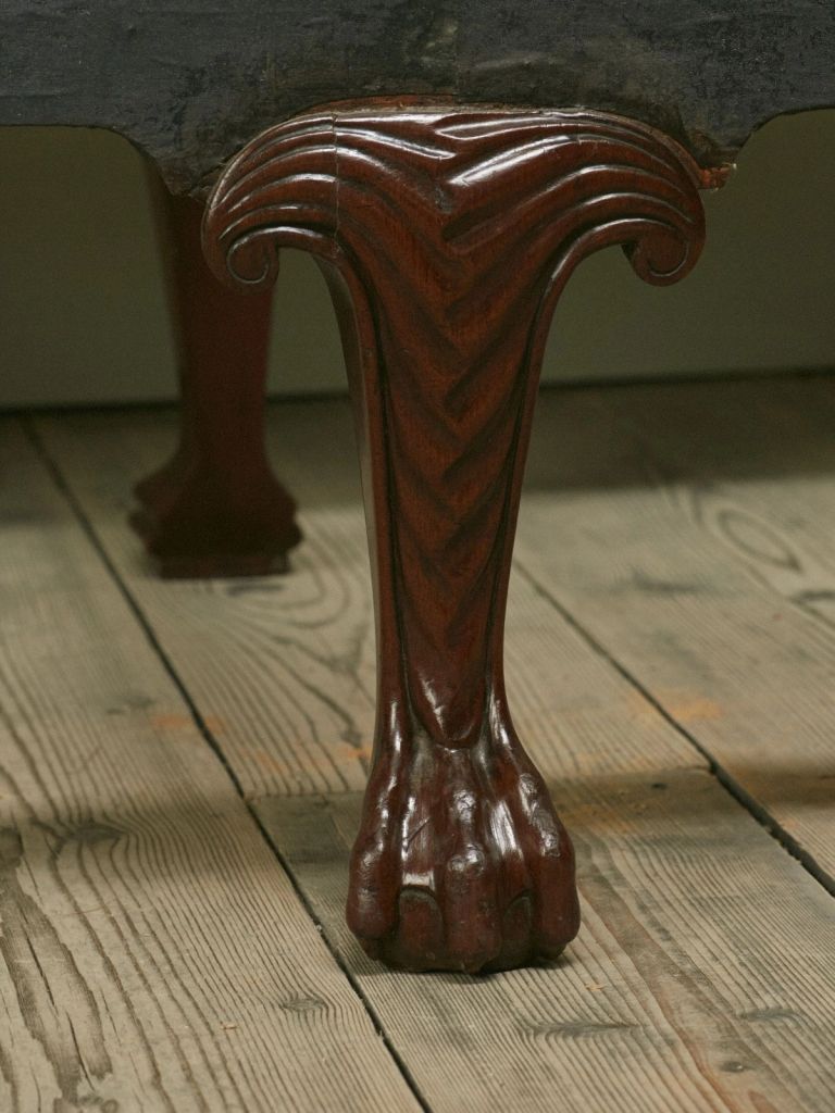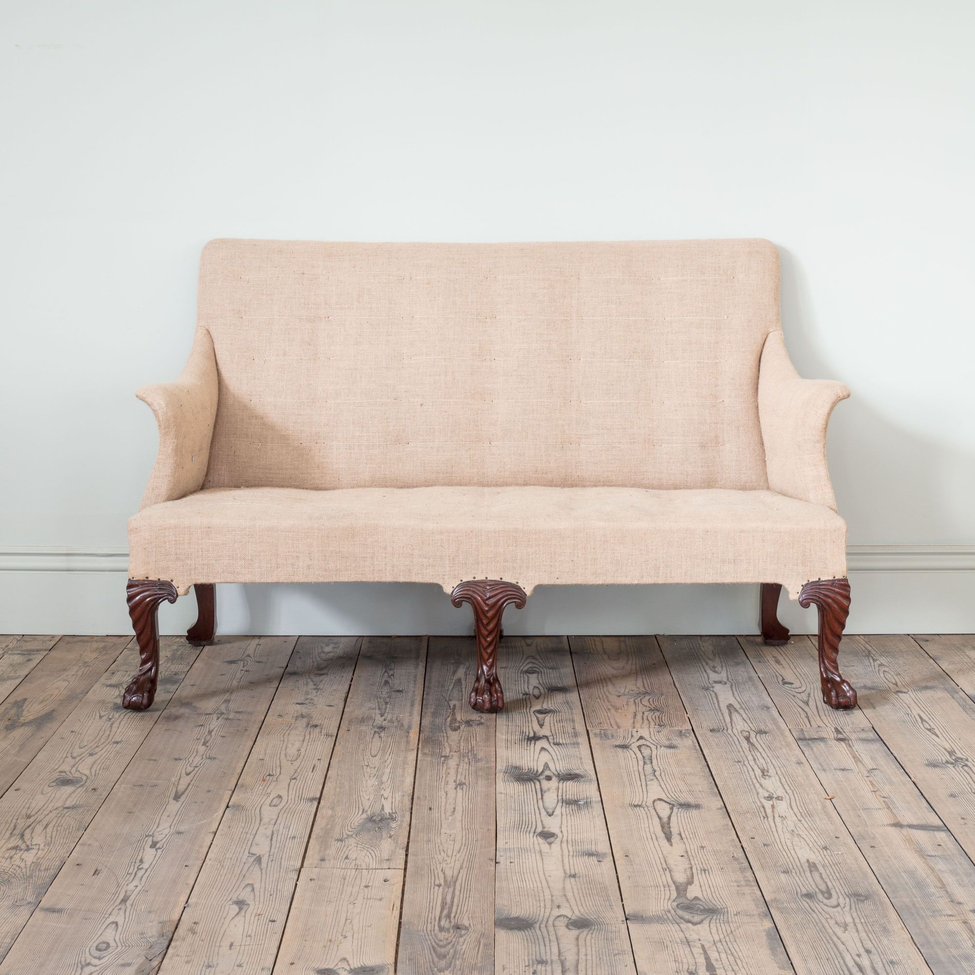 With rectangular back and outscrolled arms, supported on very unusual animalier carved cabriole legs, terminating in ball and claw feet.