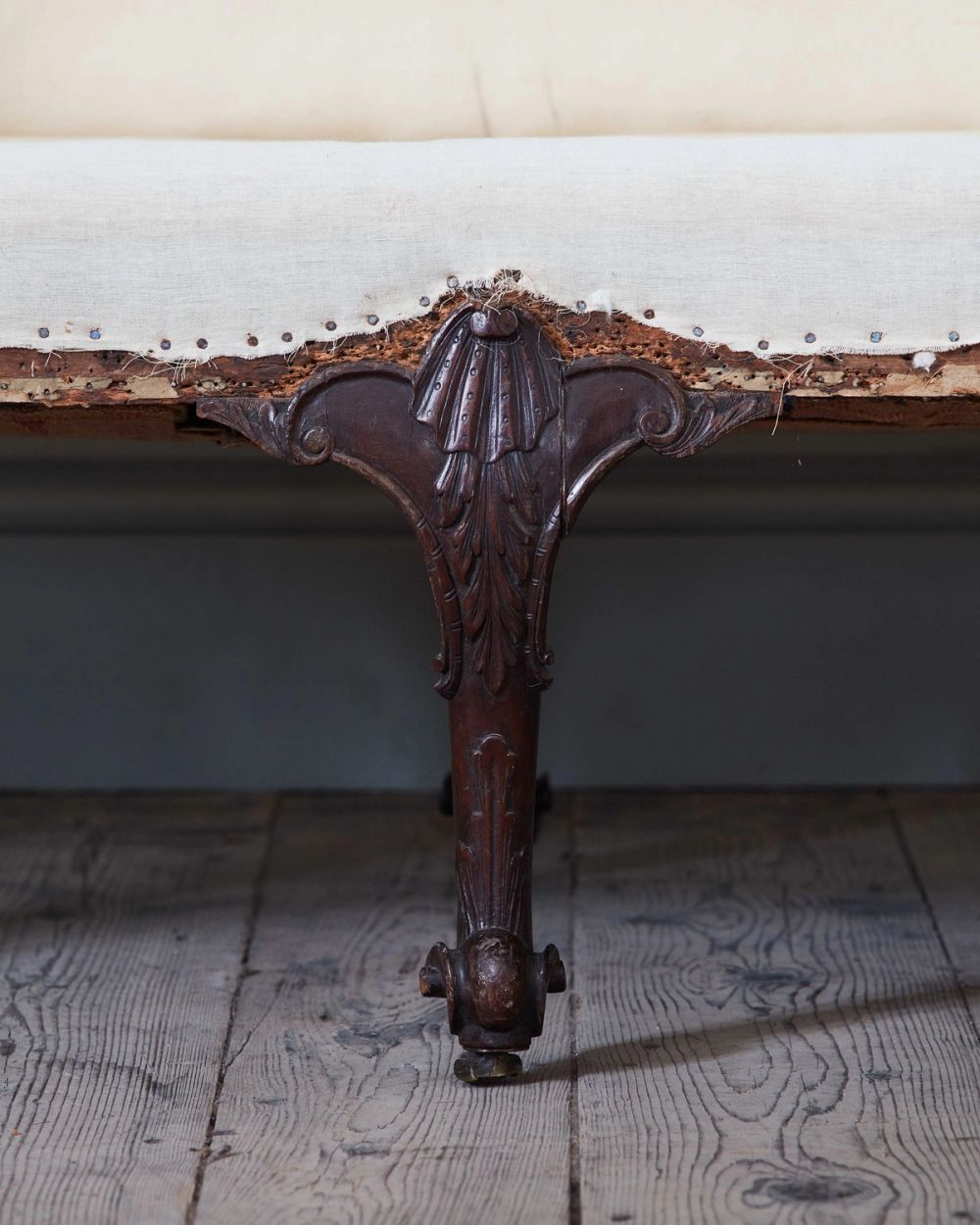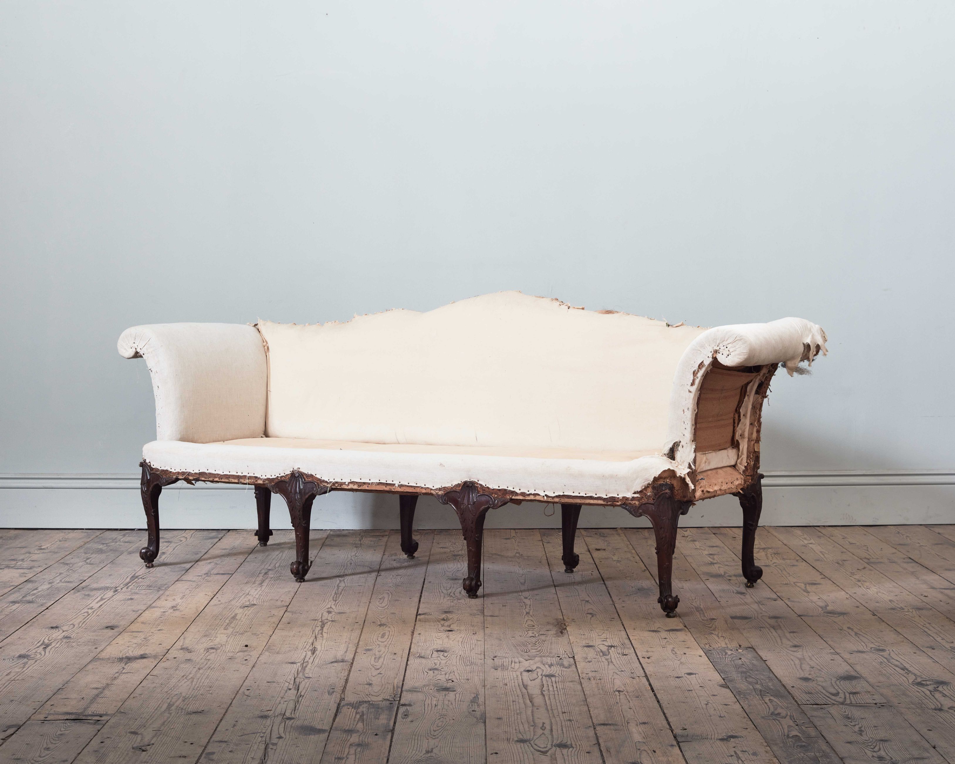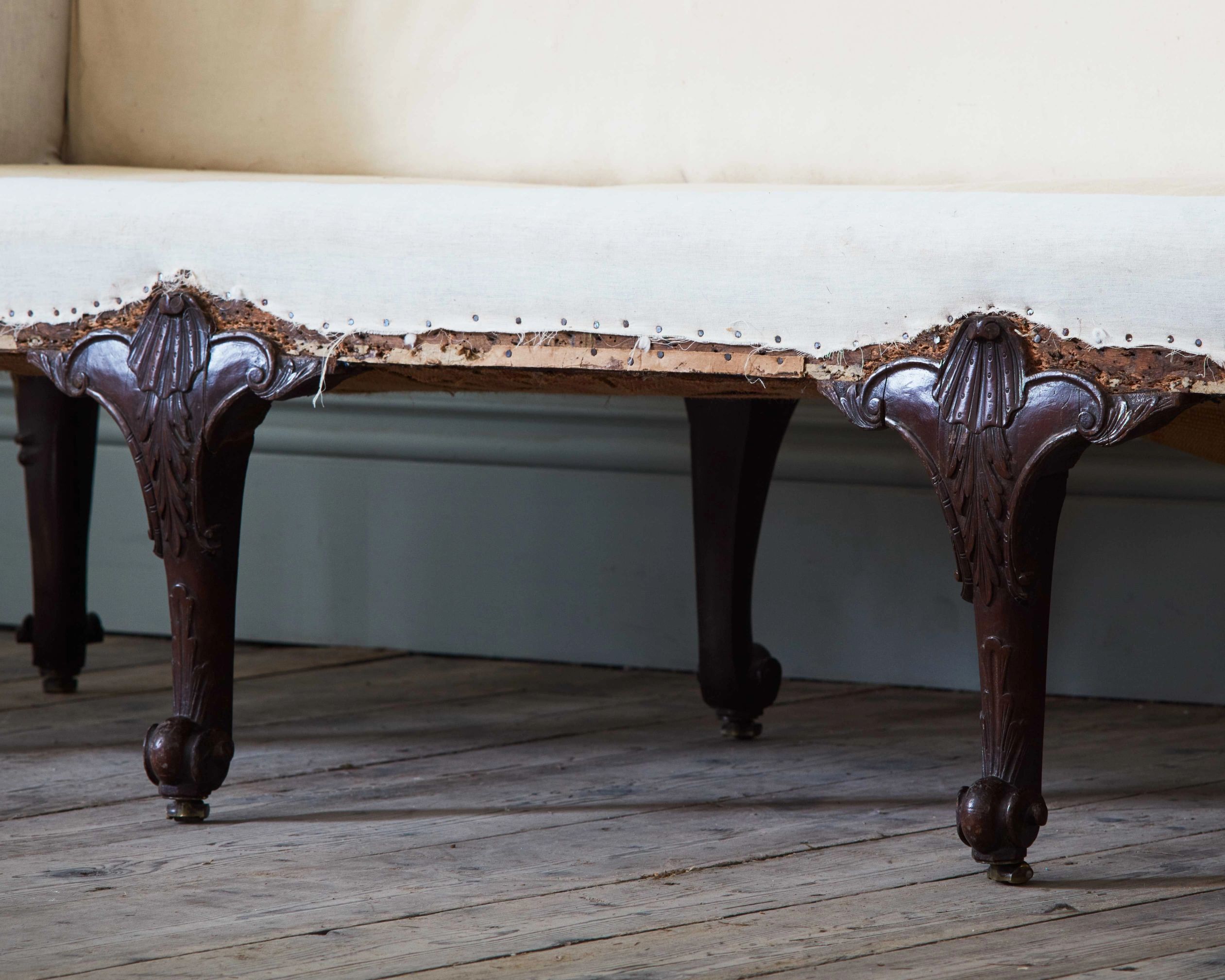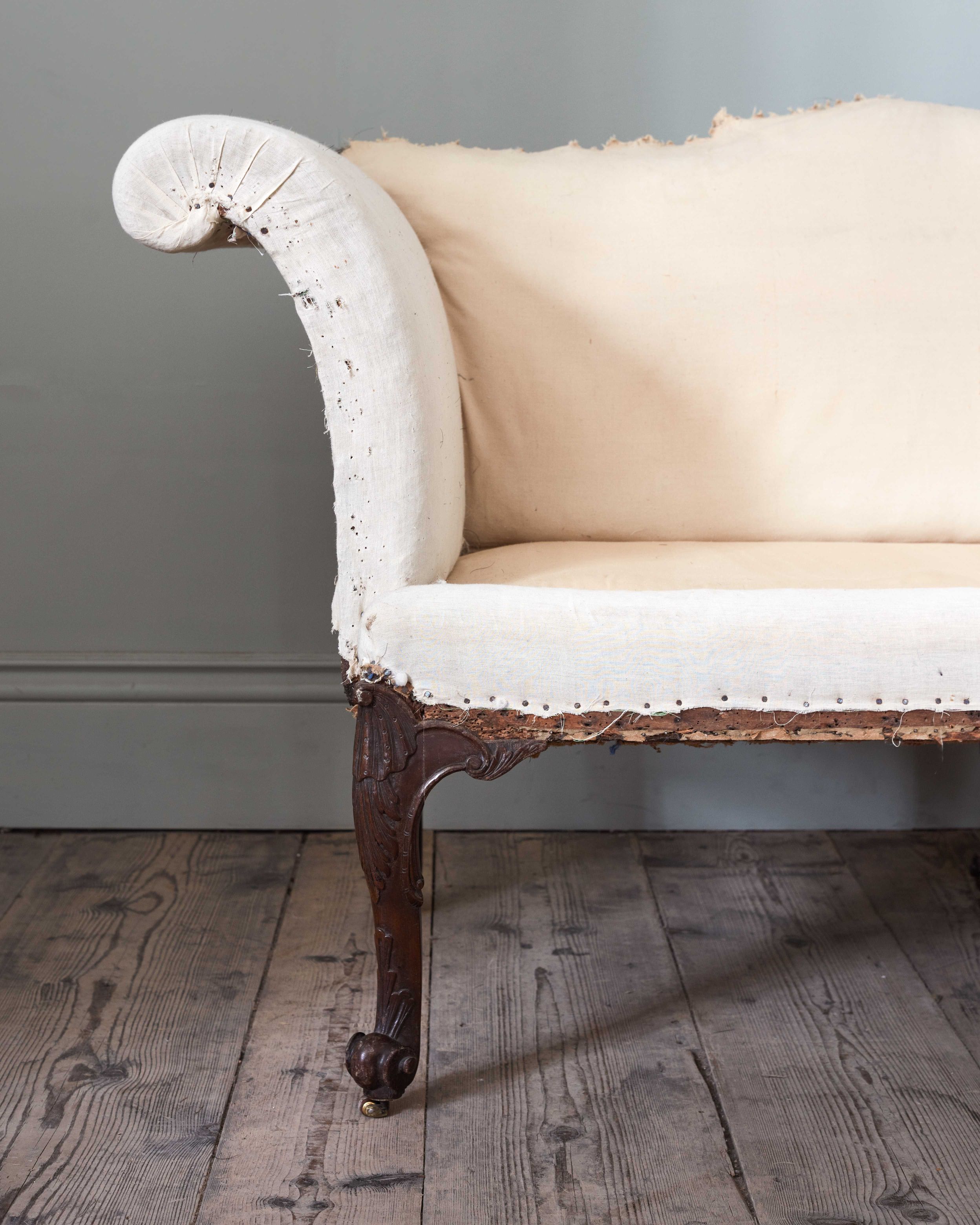With beautifully shaped back, and gently scrolling arms, on carved cabriole legs on brass casters, the mahogany surface perfectly untouched and with a superb dry patina.