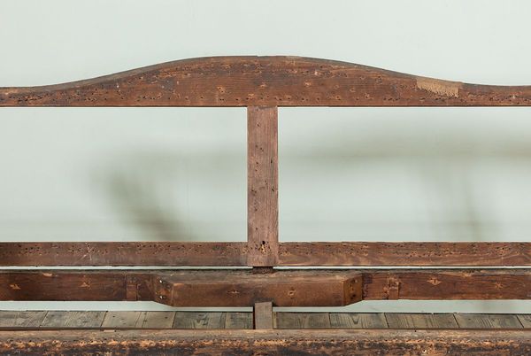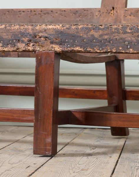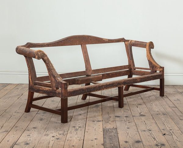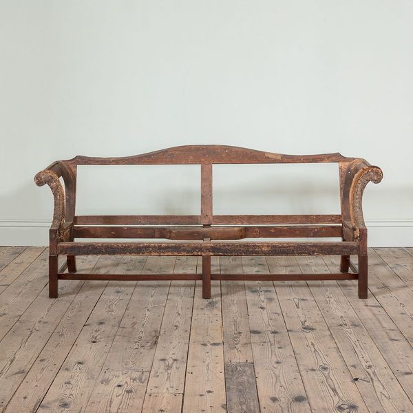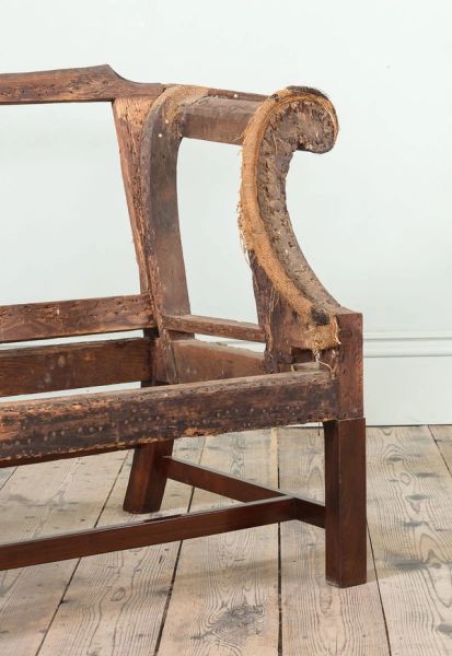 Photographed here without upholstery, showing the well-drawn lines of the camel back, gently curving outscrolled arms, and straight legs united by stretchers. A lovely dry and soft mahogany timber surface, and low grounded posture.