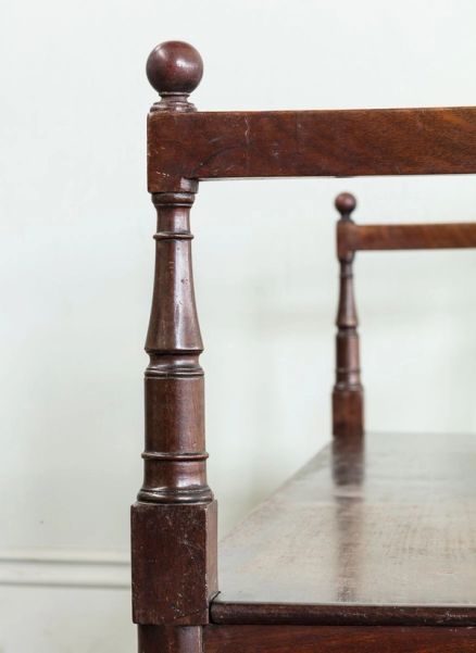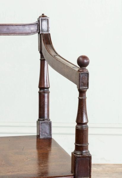 With slender moulded back rail, on turned arms on rectangular solid seat, with four turned and tapering front legs.
