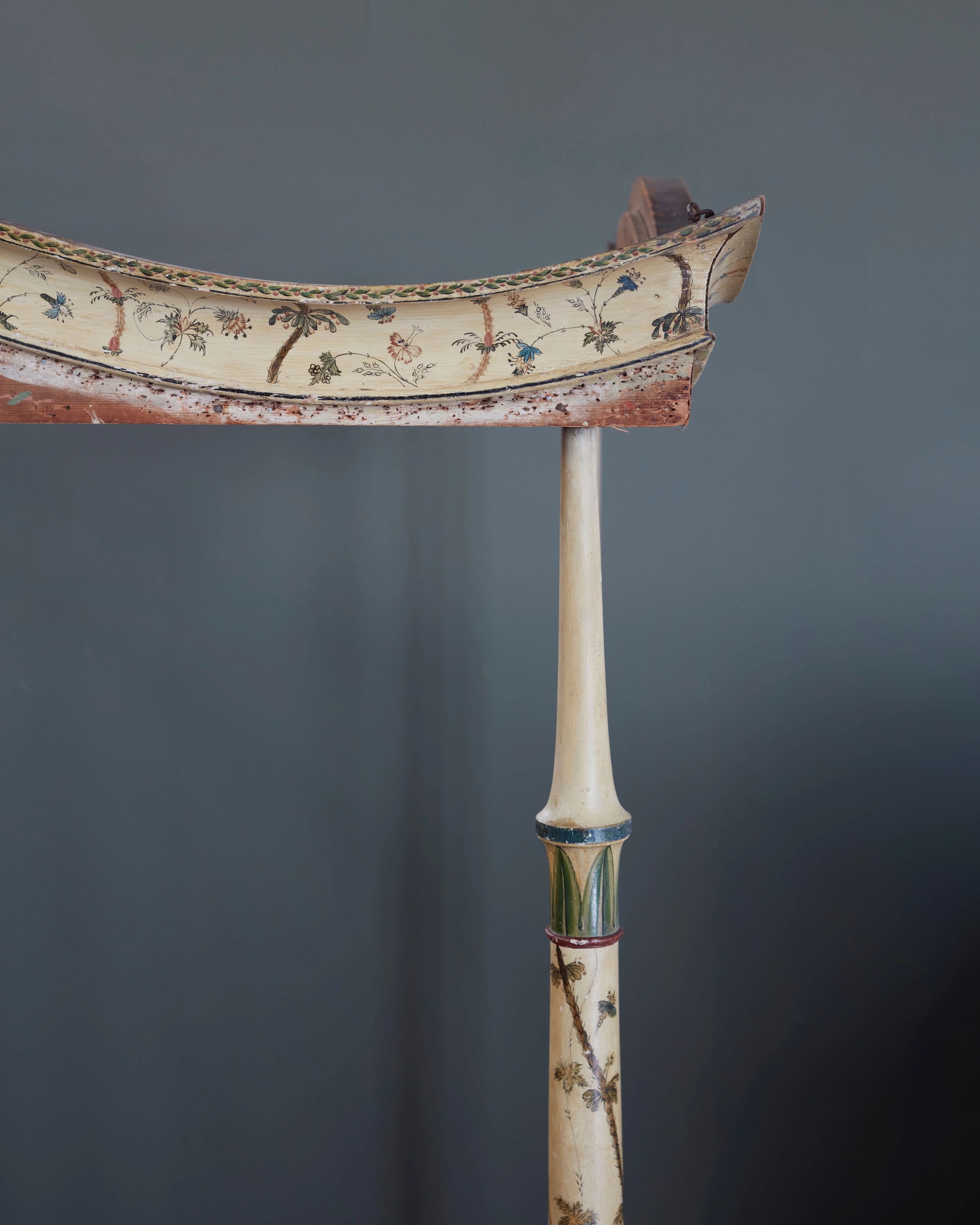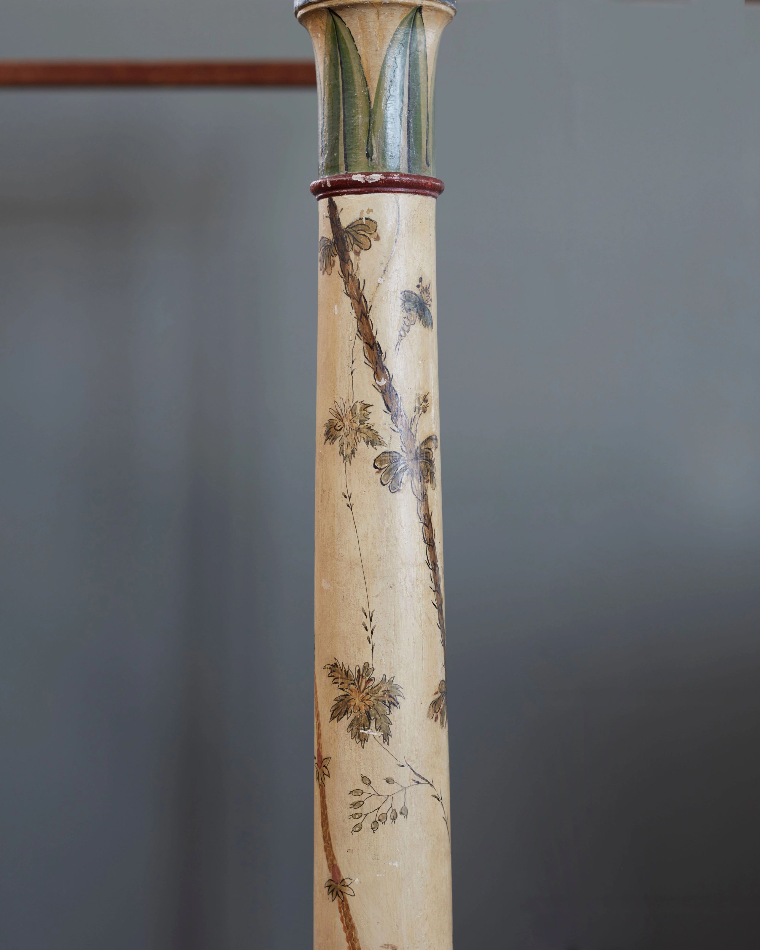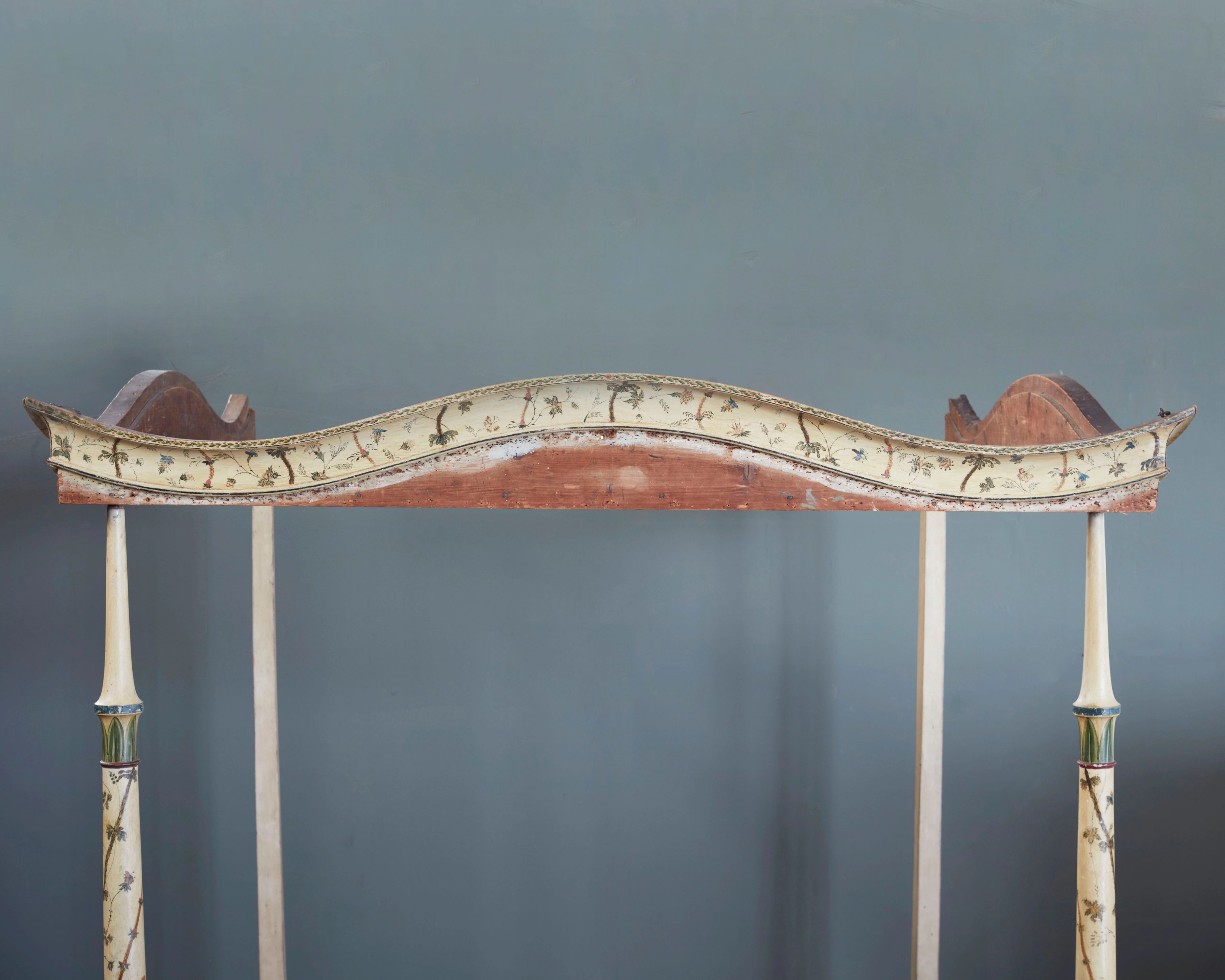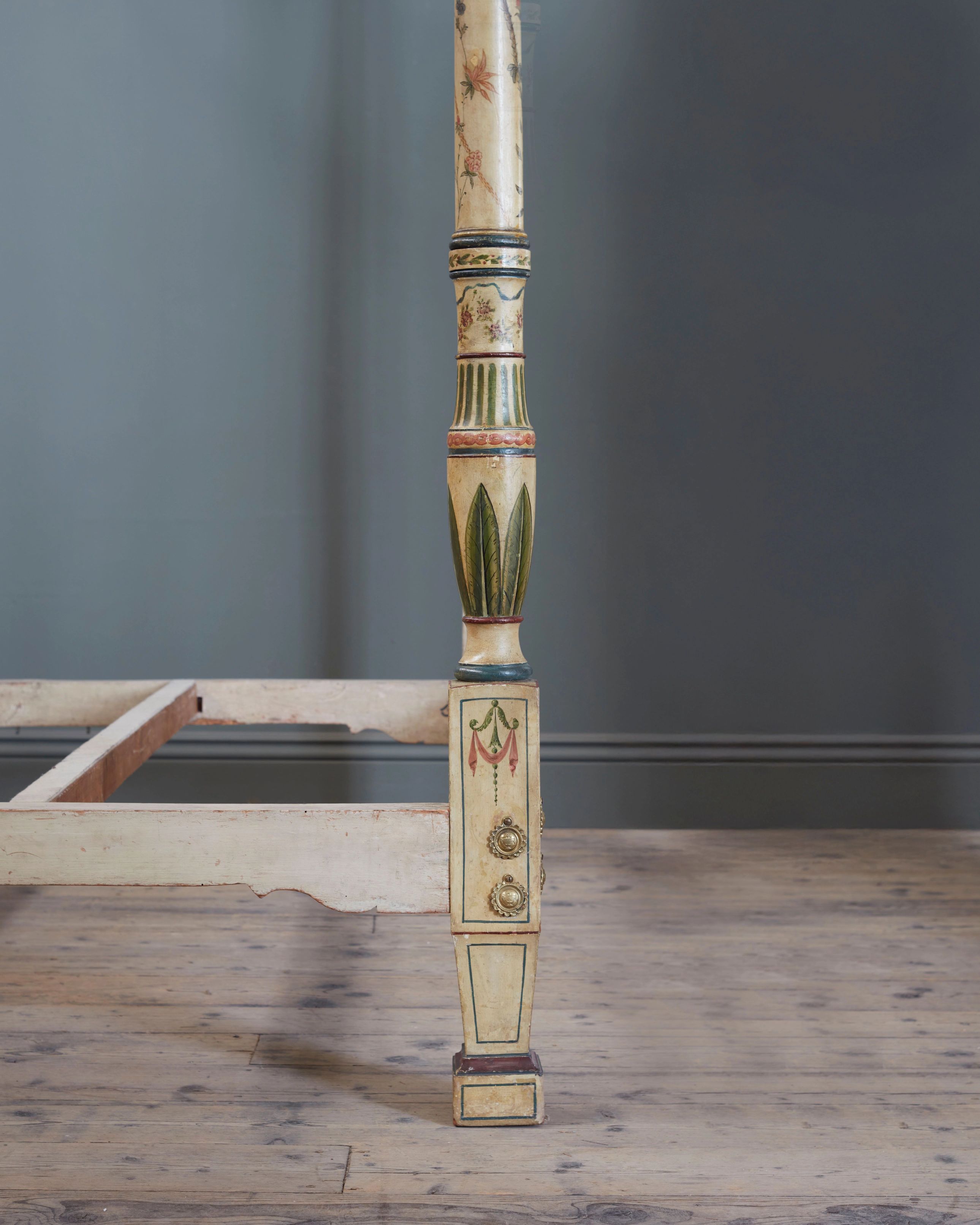 The arched cornice and four fluted posts painted with polychrome floral vines (decoration mostly original with some refreshments), a with a soft, lustre to the decorative paintwork. Incorporating hues of chalky white, soft green, teal blue, and raspberry pink. English, c.1780. Attributed to Ince & Mayhew.