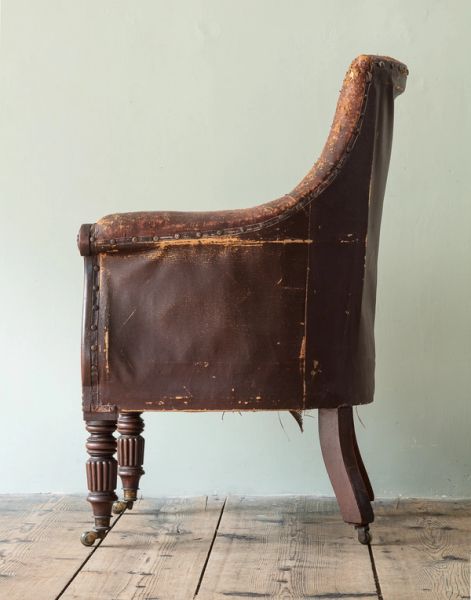 A particularly fine example of the form, the archetypal lyre-front decorated with floral paterae, acanthus leaf fringing, standing on gadrooned front legs and splayed back legs, on original brass castors. The leather upholstery in overall very worn condition, dry and untouched.