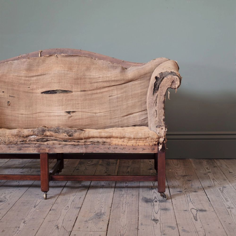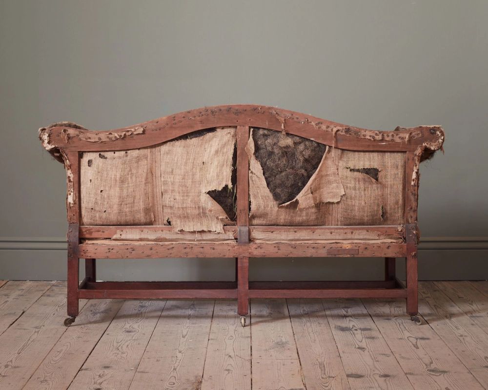 Of perfectly proportioned form, compact and well drawn, with grounded posture and tall scrolling arms, and gentle camel back.
