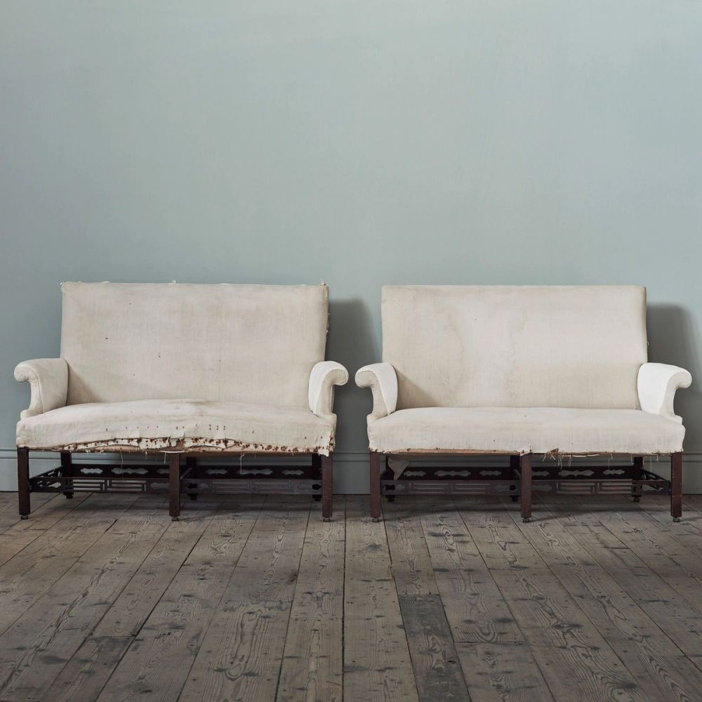 Of pleasingly compact form, with straight back and tightly curving C-scroll arms, with Chinese-Chippendale pierced stretchers and square legs terminating in their original leather casters. Stripped to the original white calico lining material, the mahogany frame of exceptional quality and in a perfectly dry, country house condition.