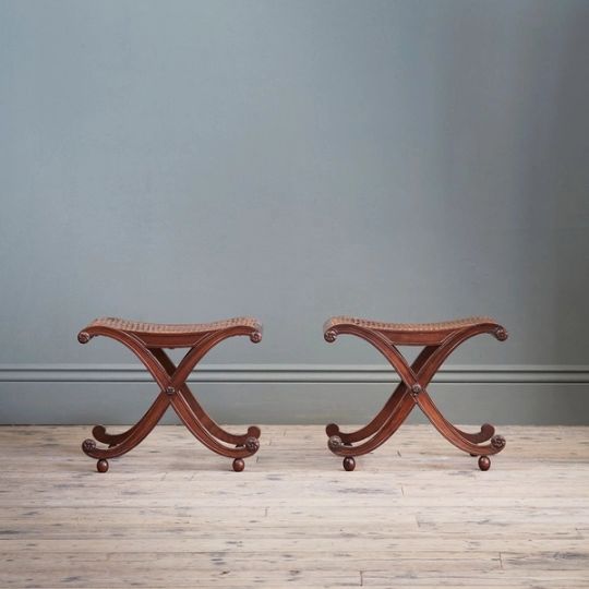 A Pair of Regency Mahogany and Caned ‘X’ Framed Stools