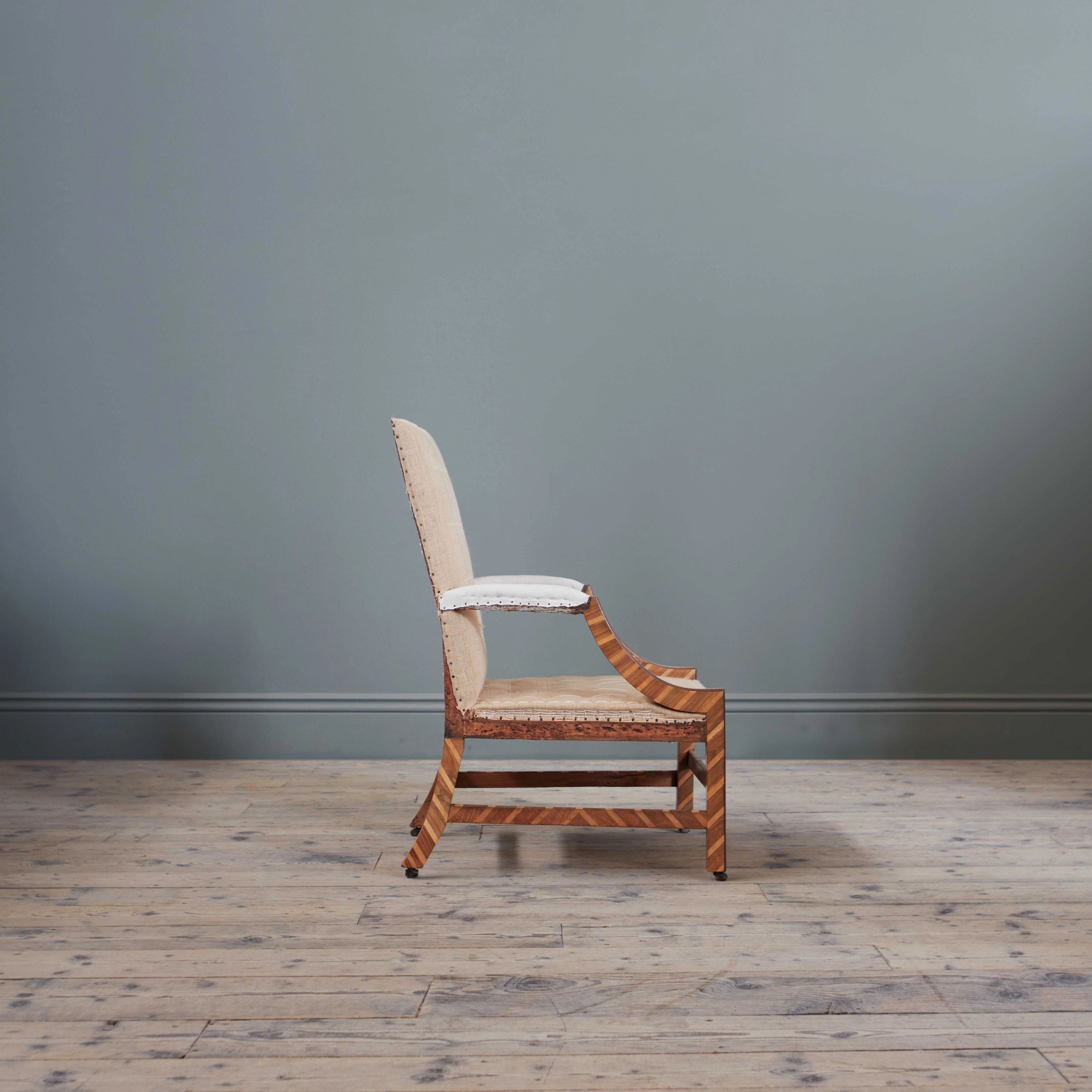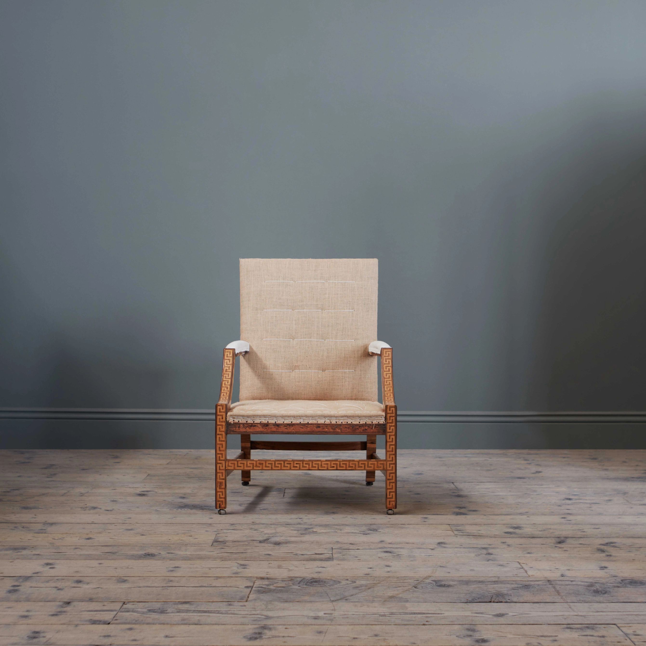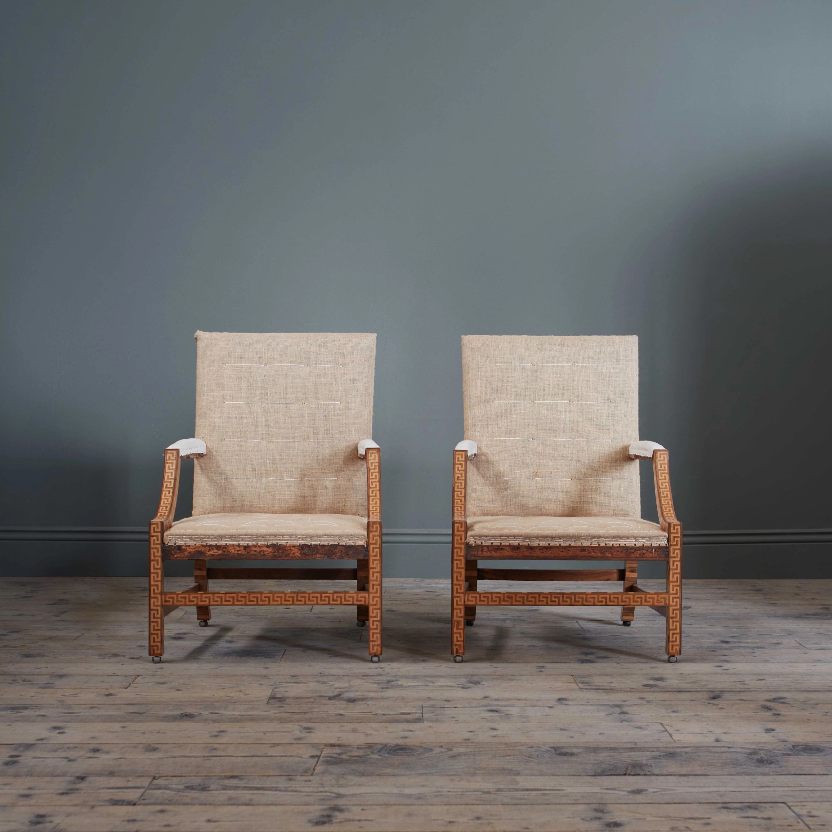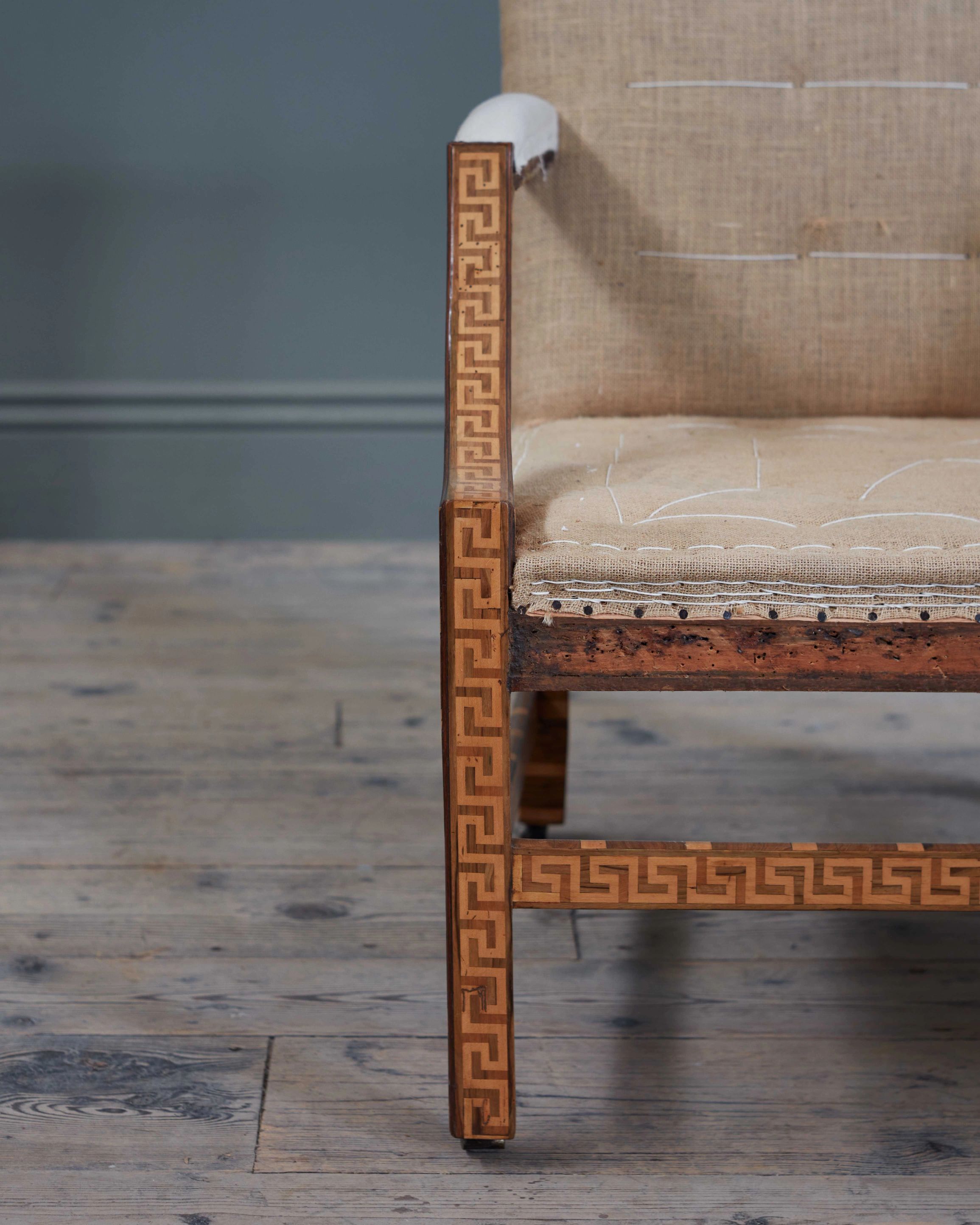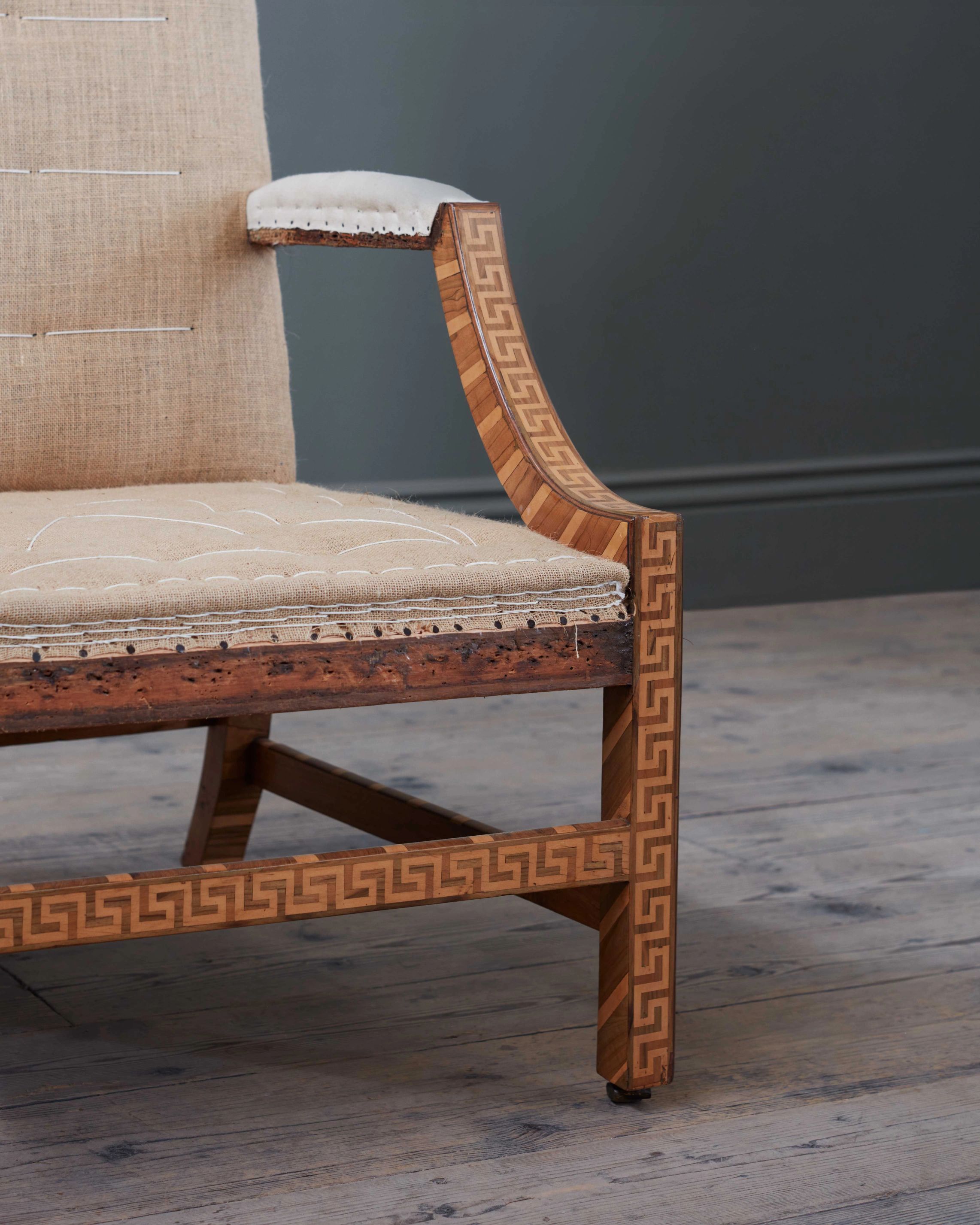 With rectangular back, downswept arms and square legs on small casters, with continuous greek key inlaid pattern. Of perfectly faded, dry form, incorporating holly and cocus wood. Upholstered to hessian, ready for covering.
