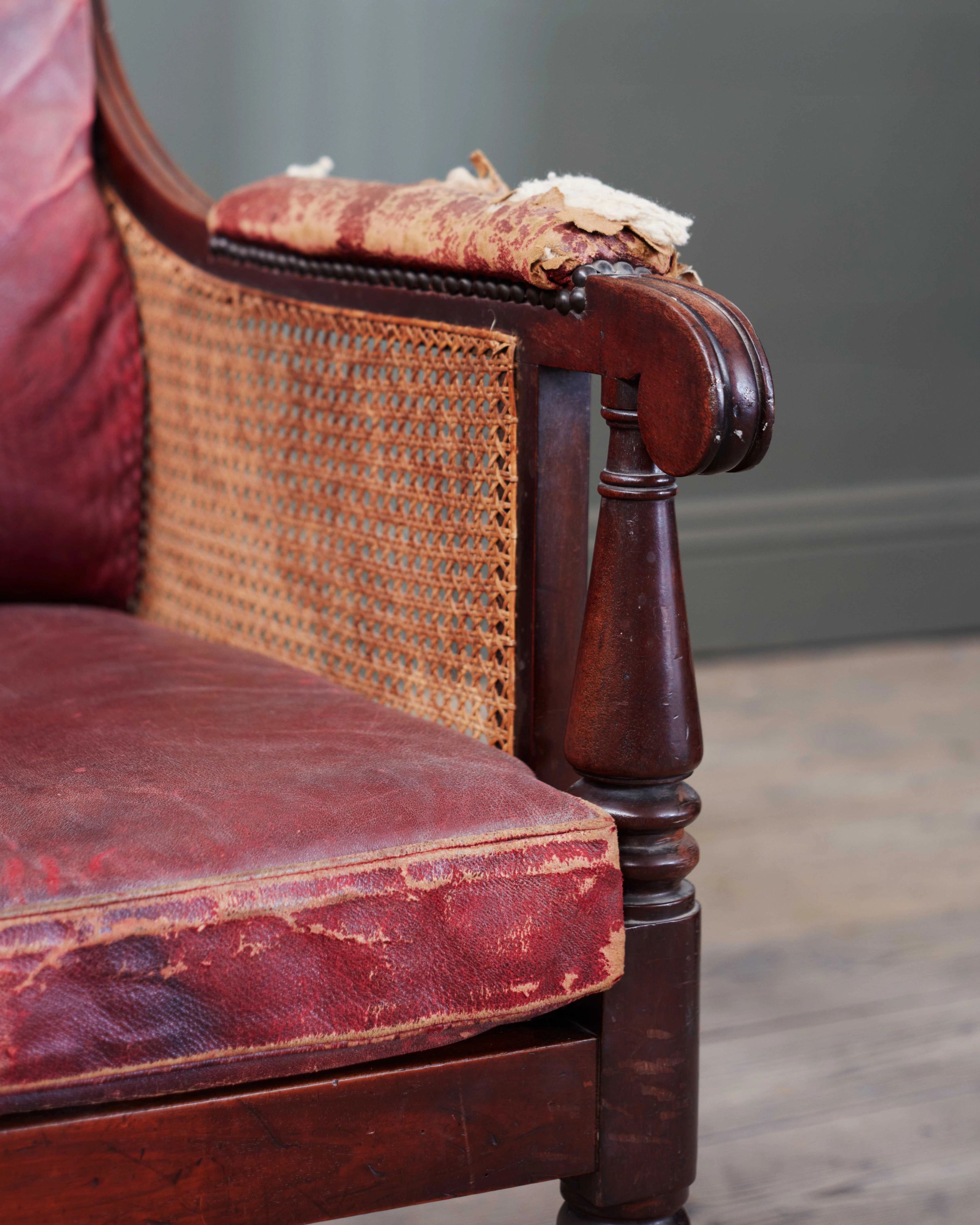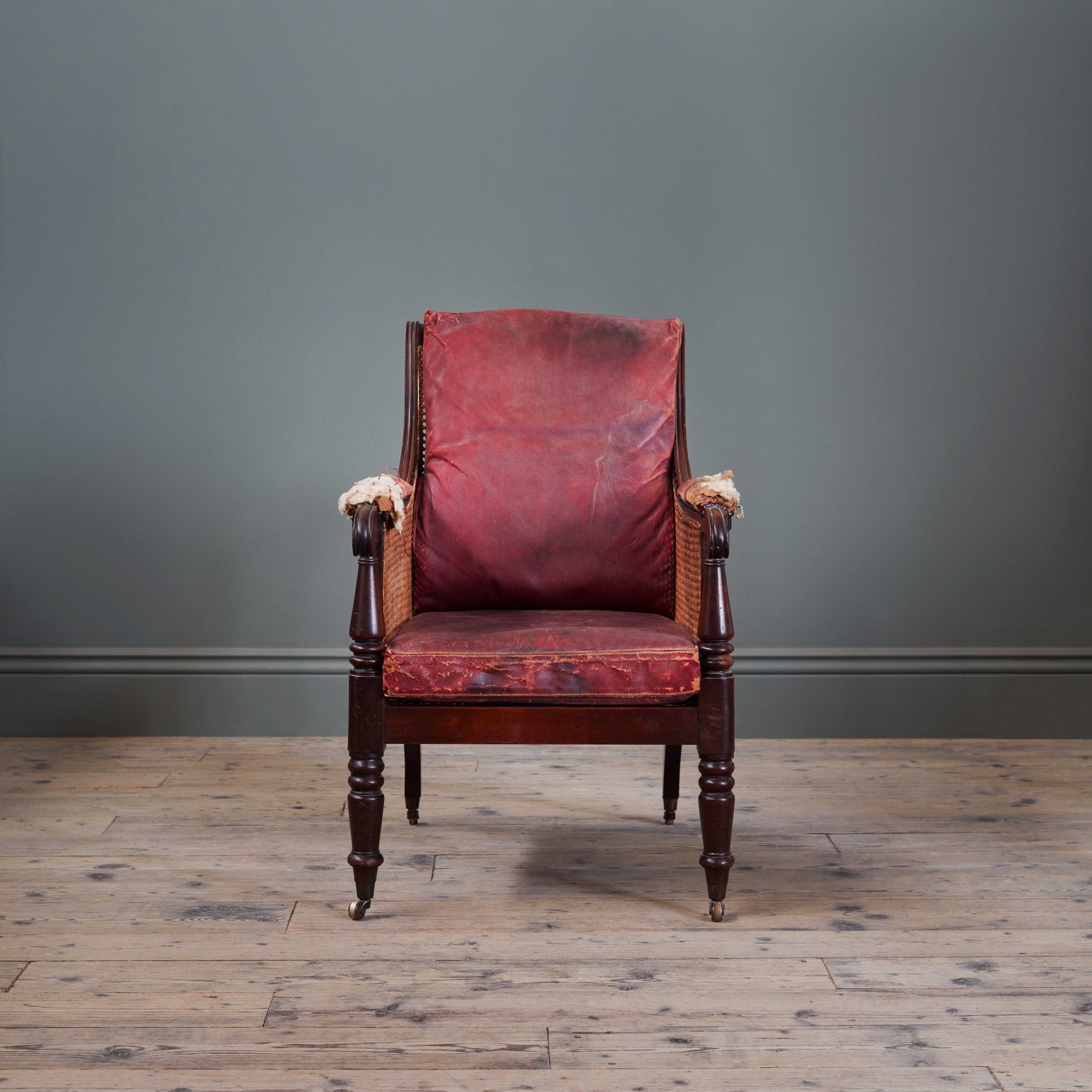 A Regency Mahogany Bergere with Old Moroccan Red Leather Cushions