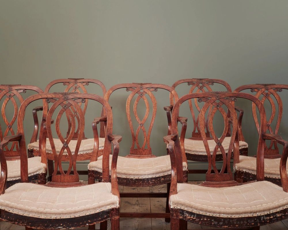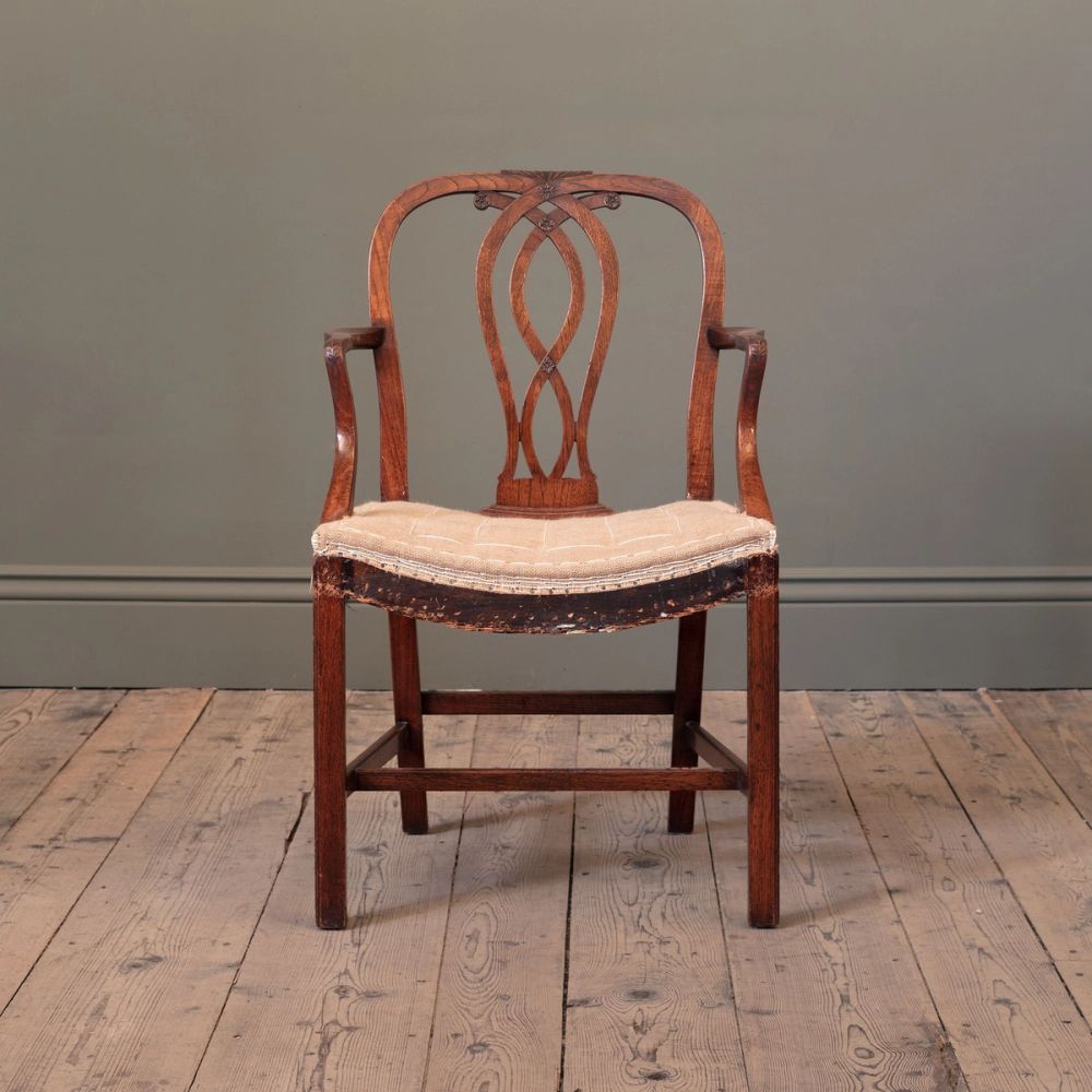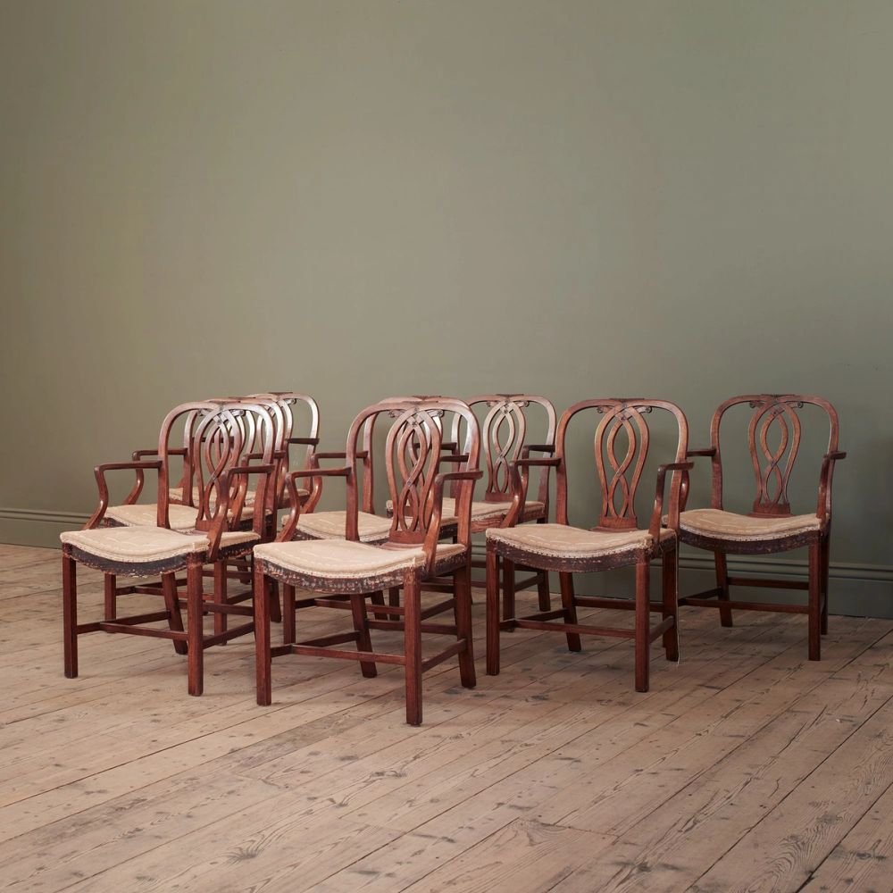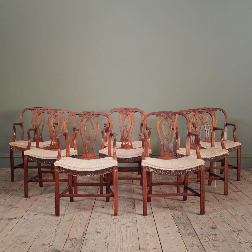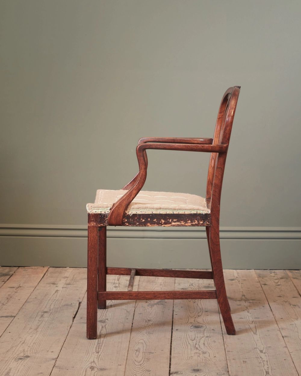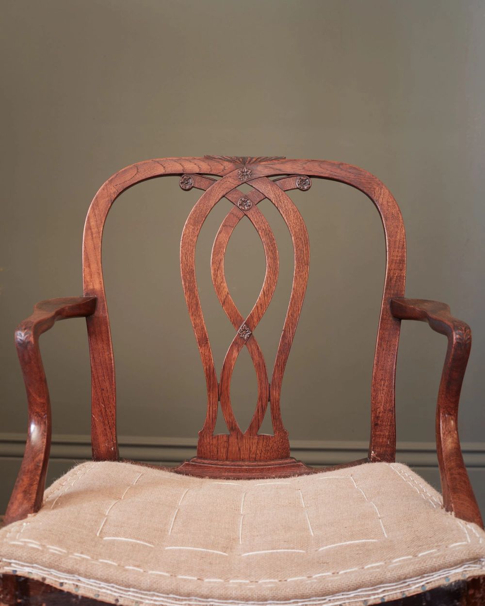 All with elbow carver arms, and shaped splat back, on gently curved upholstered seat, and straight square legs with small pencil moulding. Upholstered to stitched hessian, prior to further upholstery.