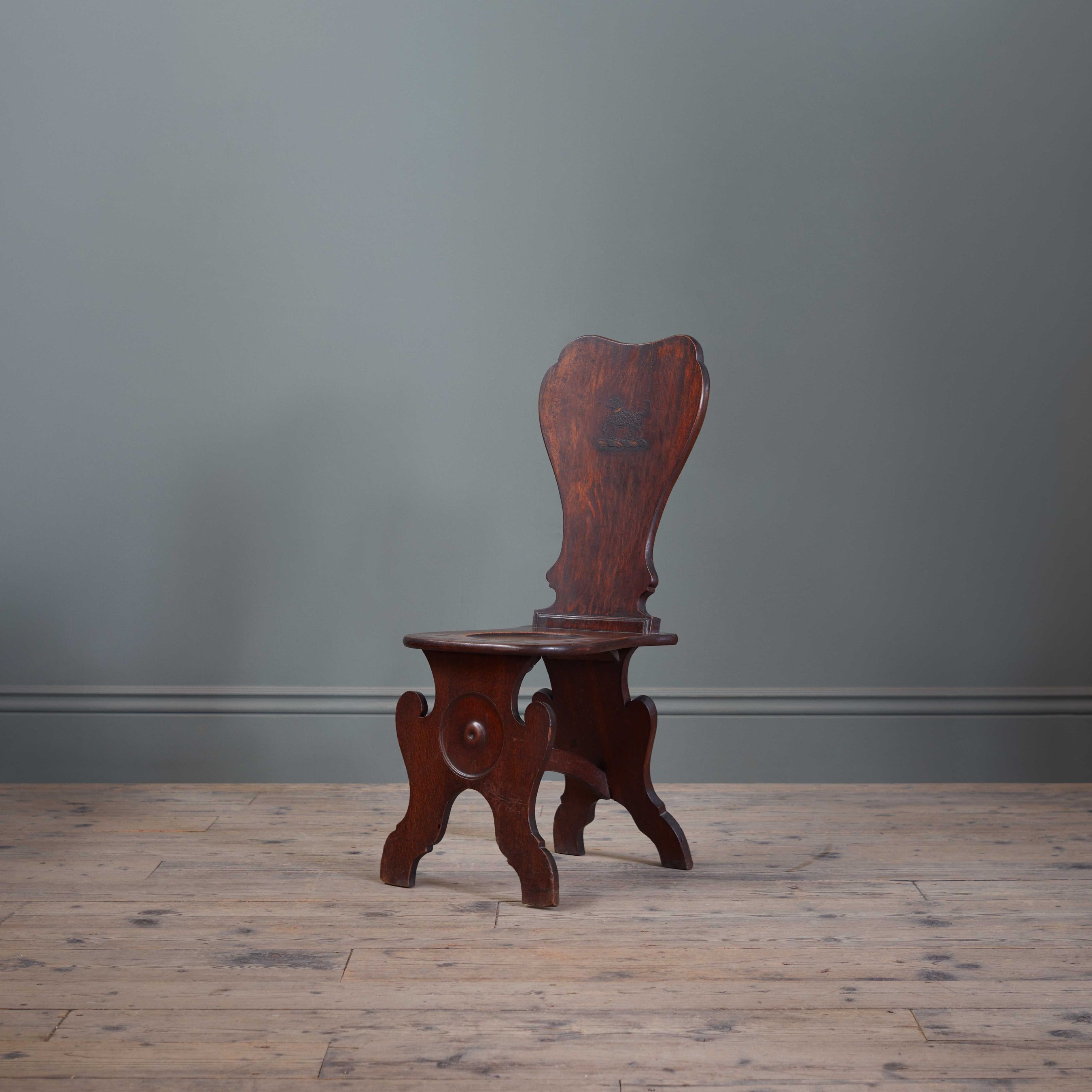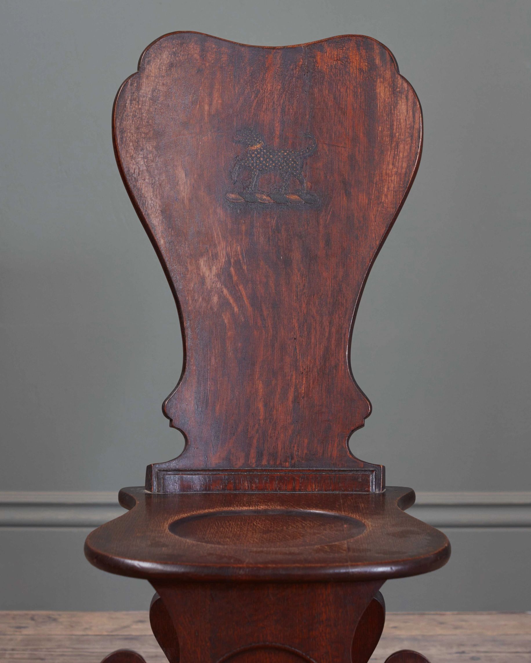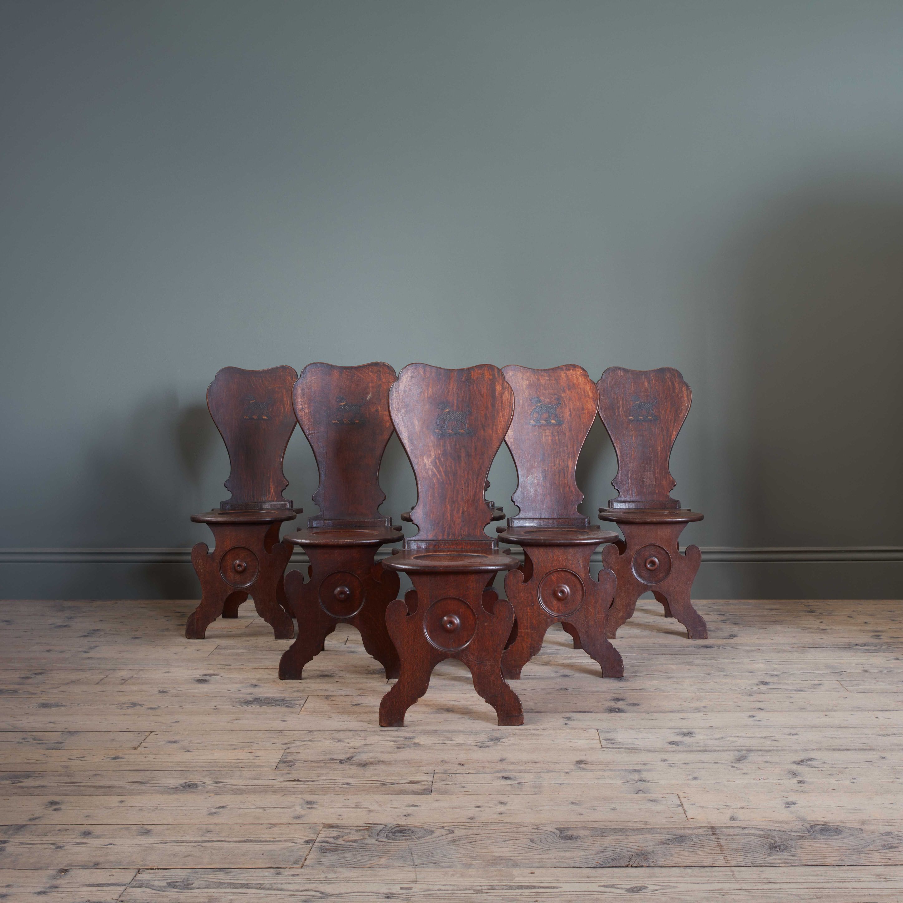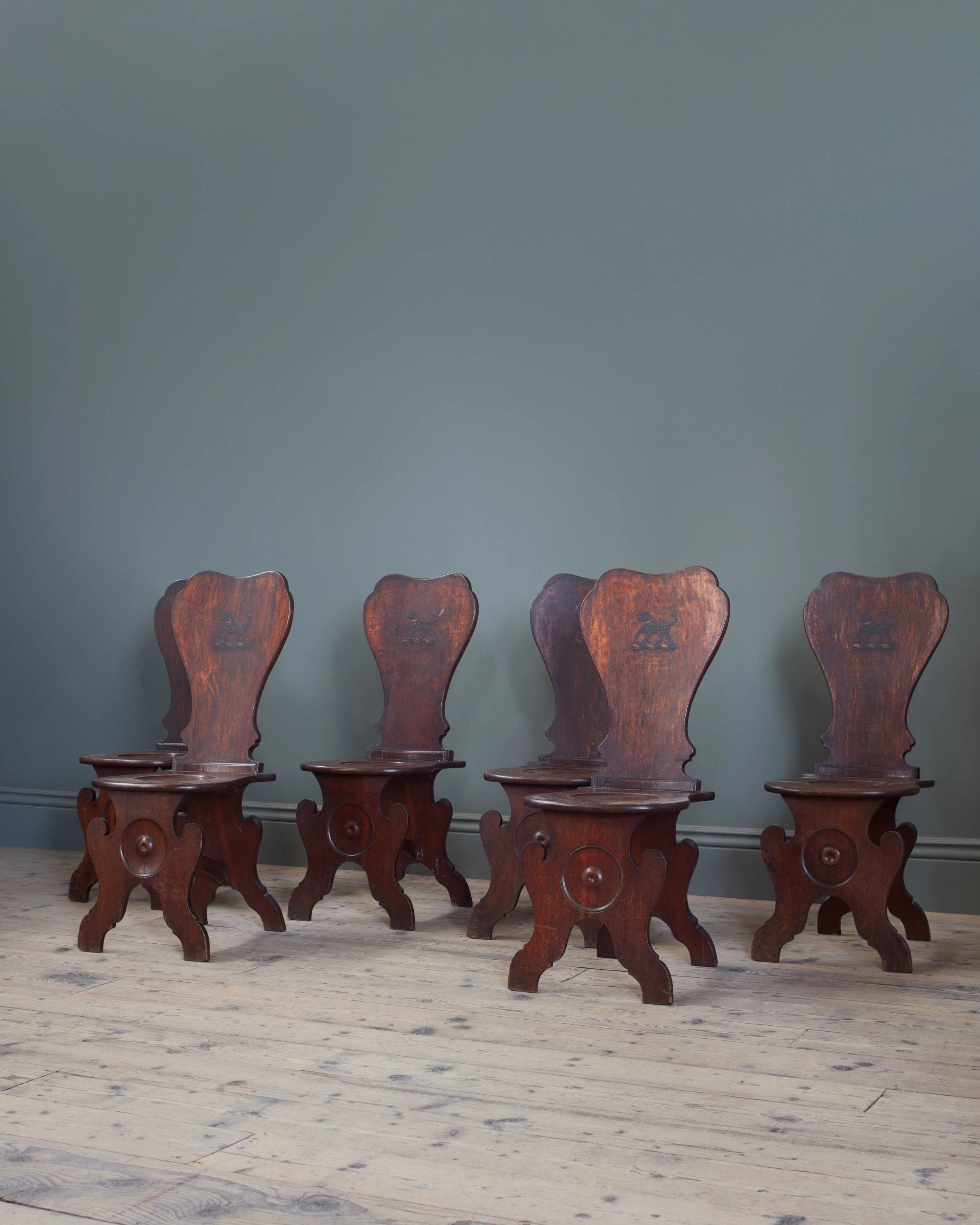 A Set of Six George II Oak Hall Chairs of Scabello Form, with Spotted Dog Cresting