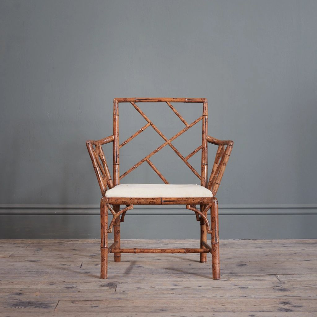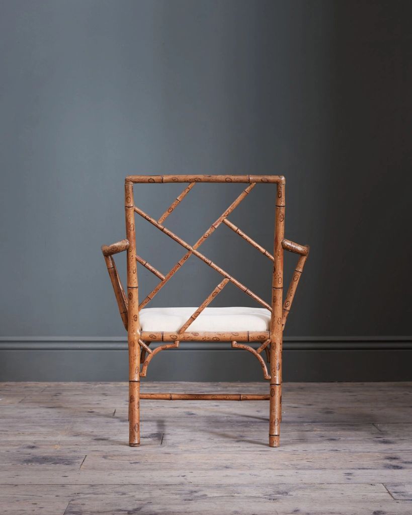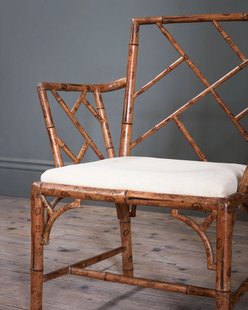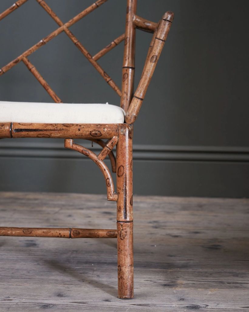 In the manner of Linnell, c.1770. Closely related in form to the Scottish ‘Cockpen’ chair, the spotted surface and faux bamboo design of these examples lend a freshness to their untouched surfaces. The drop-in seats stripped to calico, with spandrels and gently raking backs.
