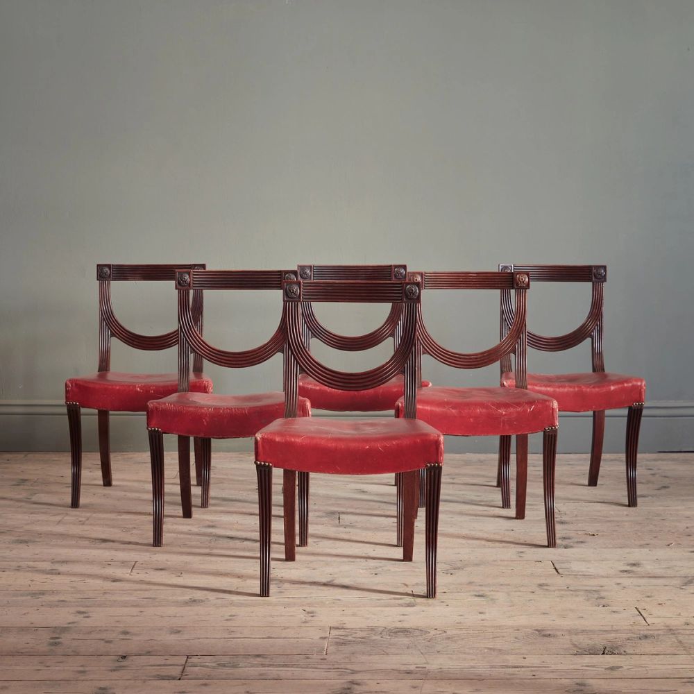With looped and reeded backs, with carved paterae depicting the crest of the Knatchbull-Hugessen family (a known family related to Mountbattens, with extensive diplomatic and ambassadorial history) on reeded sabre legs, and worn red leather seats. Most probably hailing from the family seat, Mersham le Hatch in Kent, a house well known for its connections with Chippendale.
