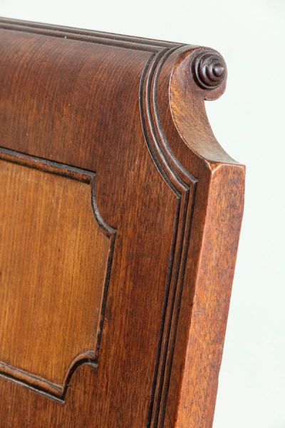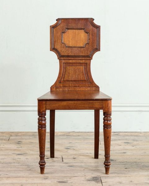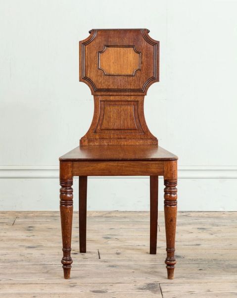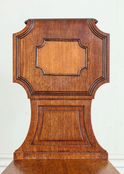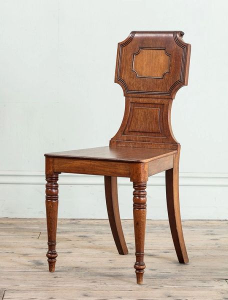 With shaped backs and modestly scrolled tops on square seats, on turned tapering front legs.
