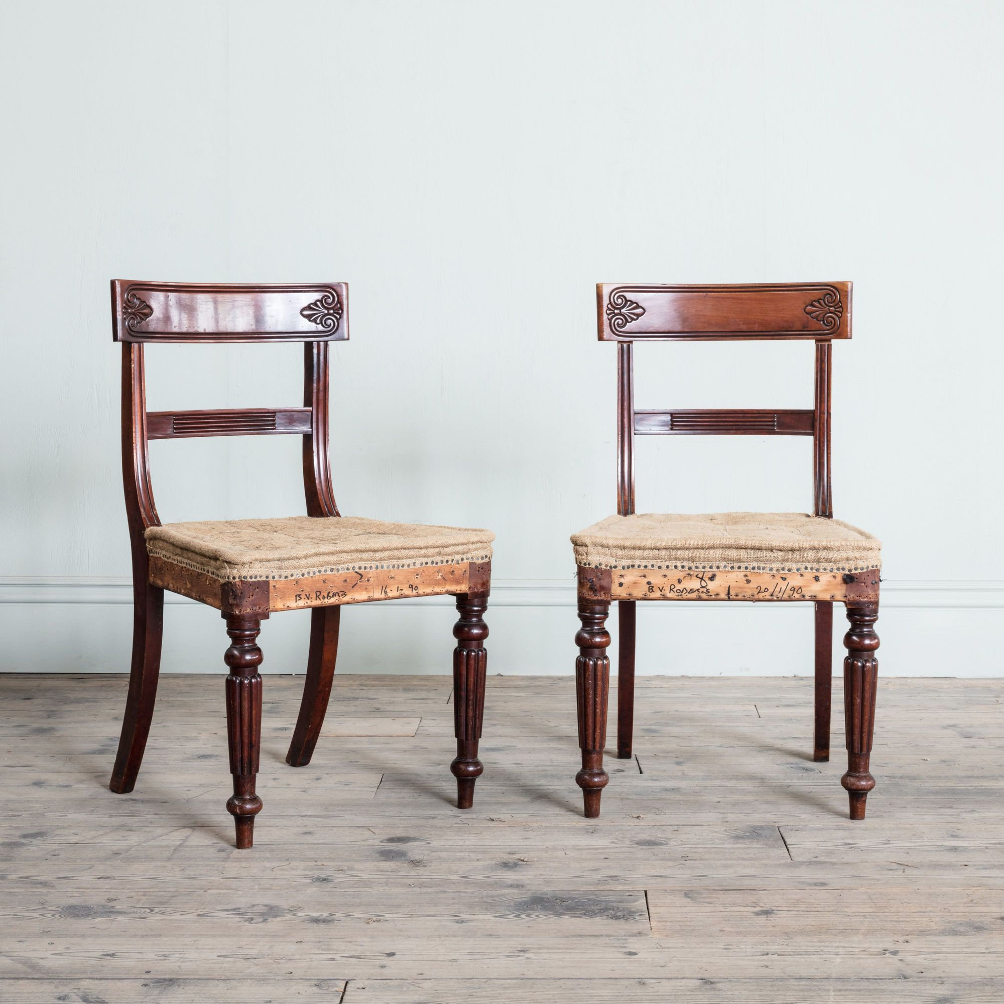 Each with a tablet top rail carved with anthemion on either side above a reeded horizontal splat and fluted uprights, on hessian covered seat, above turned and reeded tapering front legs. The overall design of this elegant set of dining chairs derives from designs for chairs in the Greek Revival style popularized by Thomas Hope in his Household Furniture and Decoration, published in 1807. This set of chairs was removed the Bath Assembly Rooms in Bath – a series of elegant reception rooms designed by Robert Wood in 1769 for public entertainment, such as card playing, taking tea, and dancing. During the Georgian and Regency period these rooms were the main hub of fashionable society, and Jane Austin often refereed to these rooms in her novels, such as Northanger Abbey and Persuasion. The Assembly Rooms today are listed as a Grade I building by English Heritage and are owned by the National Trust.