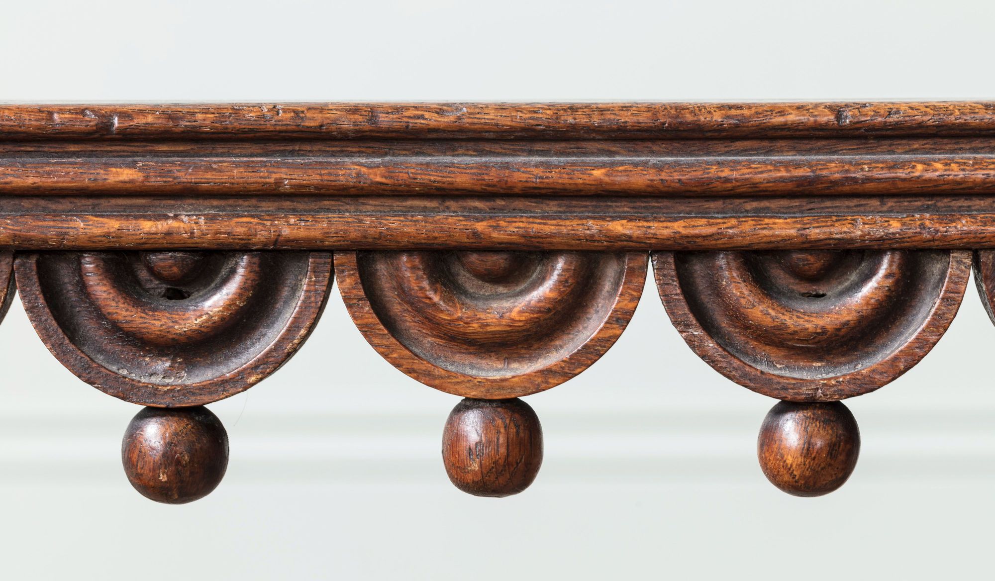 With turned bolster lotus leaf supports, above a panelled seat with a frieze of half roundels and ball pendants, on turned fluted legs, c.1815.