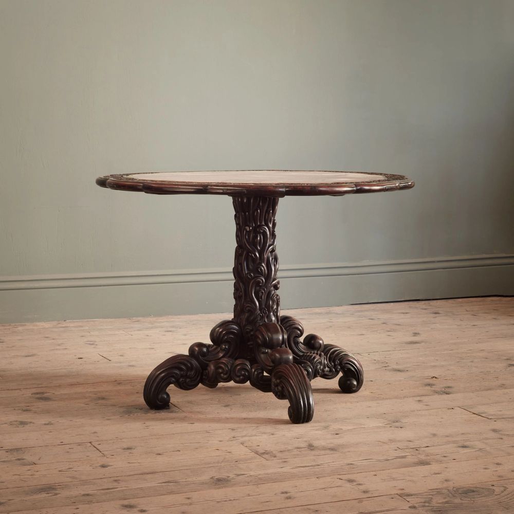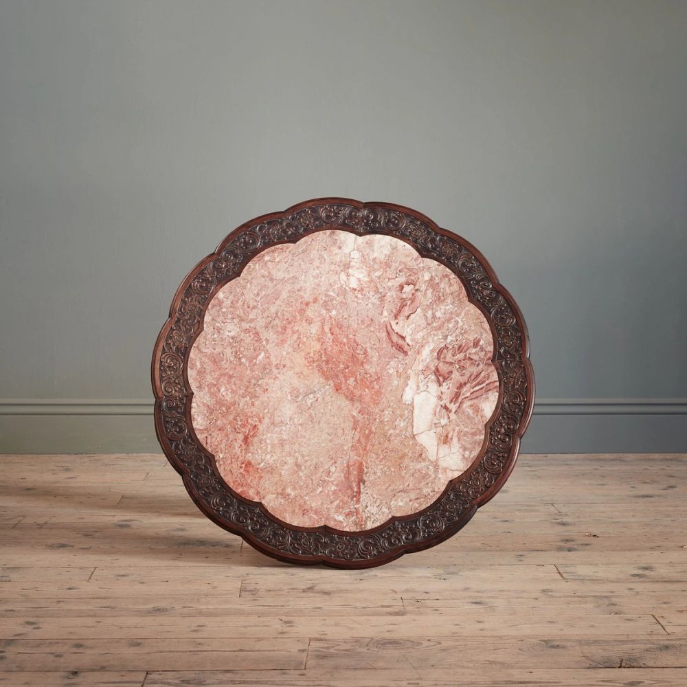 The circular lobed shaped with inset rose marble top, on a texturally carved pedestal base and elaborate central column.
