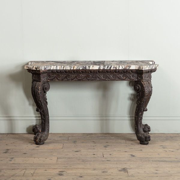 The ‘deal’ frame with painted surface, with canted corners, carved egg and dart support on Vitruvian scroll frieze, with heavily and robustly carved scrolling legs, with deeply carved acanthus leaf, on hairy paw feet. With exceptionally figured modern Medicae Violetta marble top.
