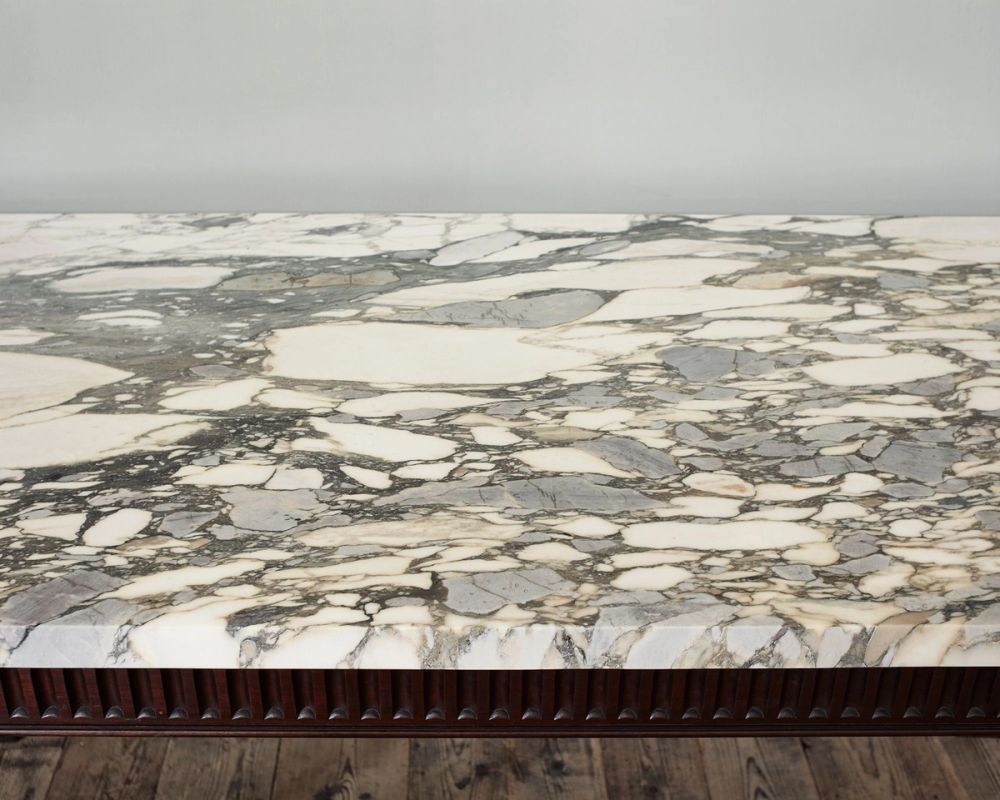 With gently stepped breakfront fluted frieze, with lightly shaped and carved spandrels, with exceptionally executed cluster column legs with acanthus carved capitals.
