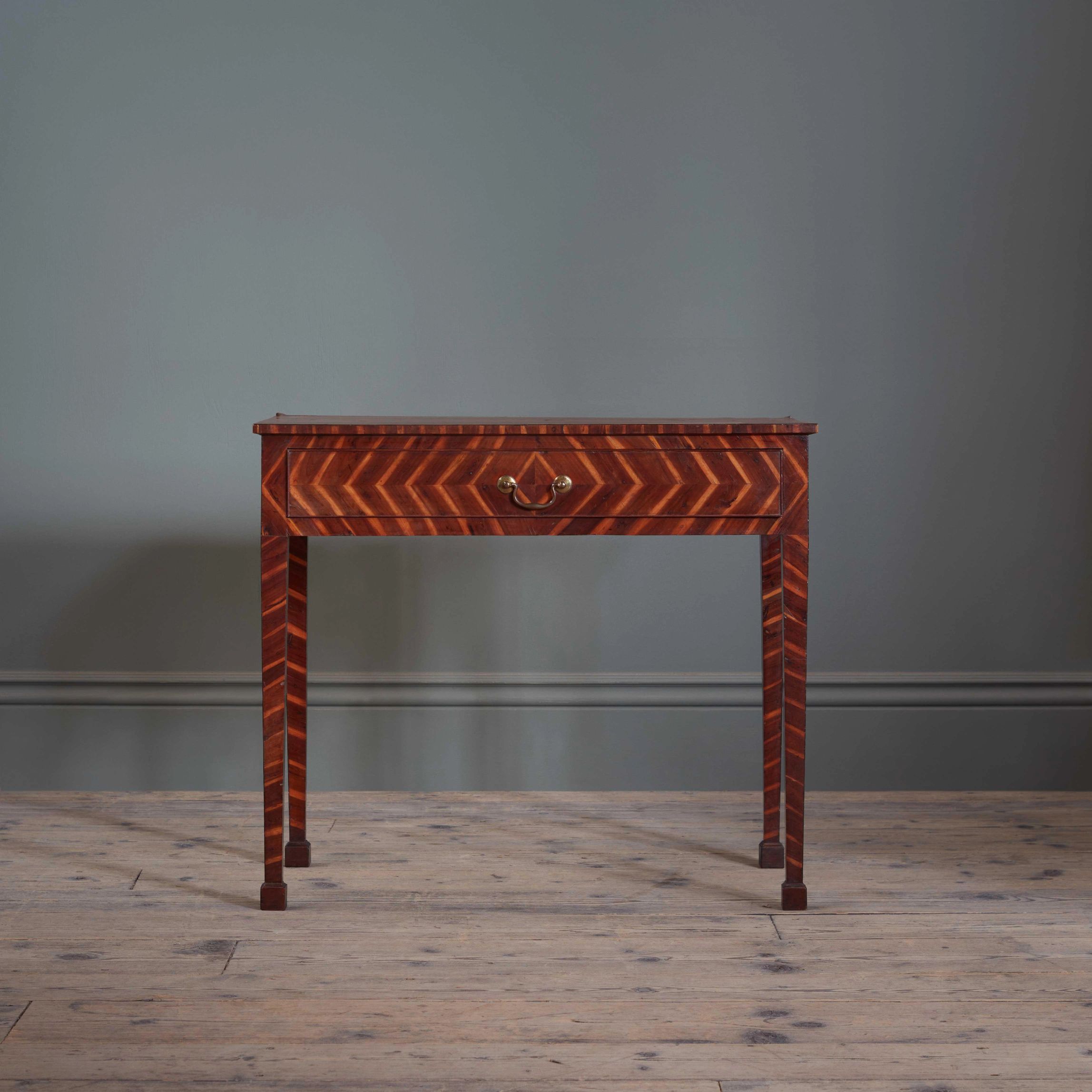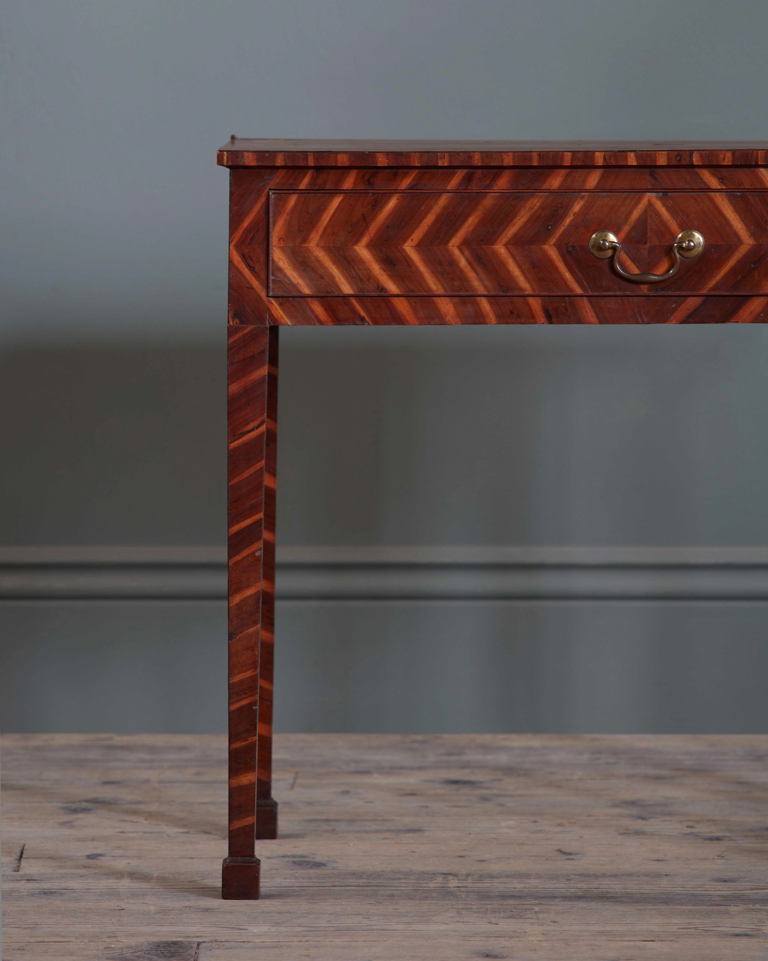 Of exceptional colour, with a dry patina and faded quality to the highly figured timber. One side with pembroke drop leaf, the other with a drawer with plain brass swan neck handle, the legs tapering to a square foot.