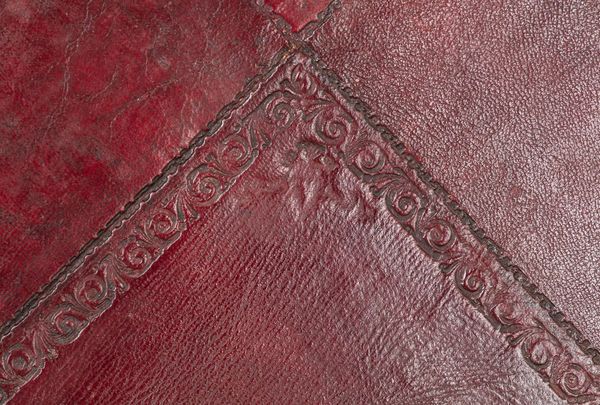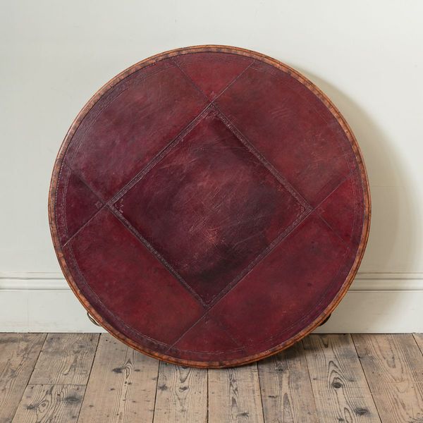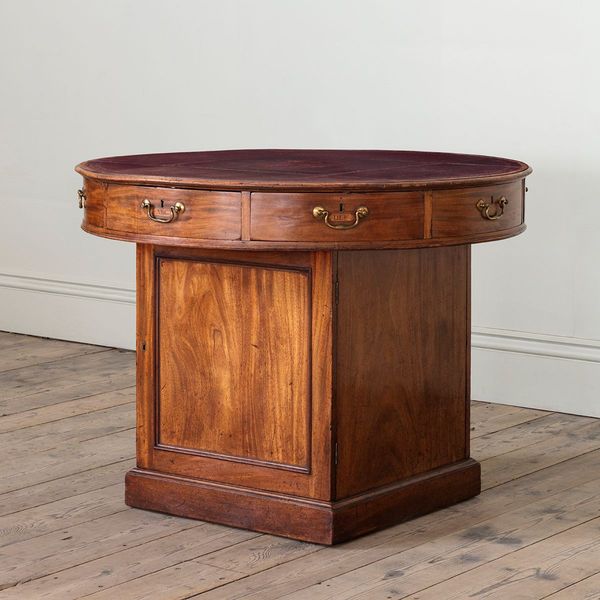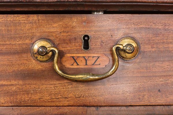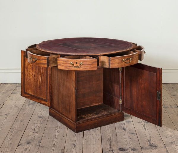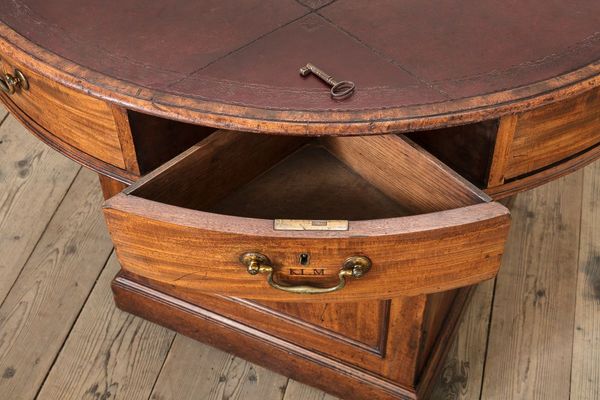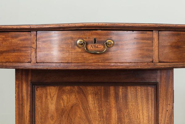 With blind tooled red Moroccan leather panelled top, each triangular and curve fronted drawer labelled alphabetically, and with gilt lacquer swan neck handles of pleasing patina, the box base with ample cabinet space to each side.