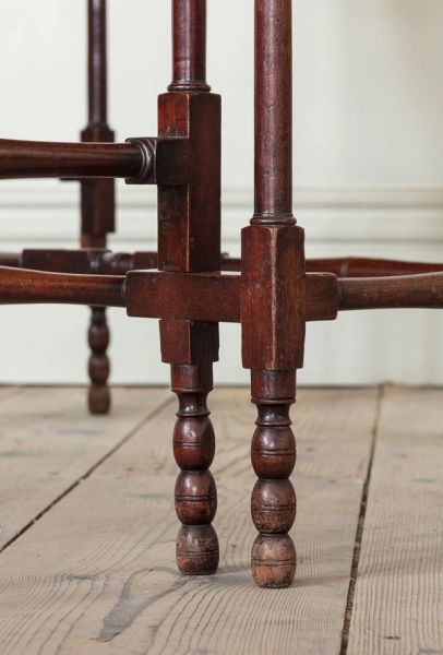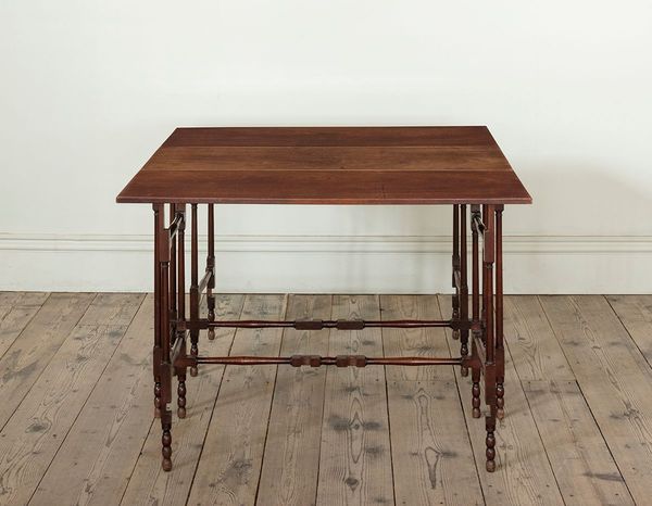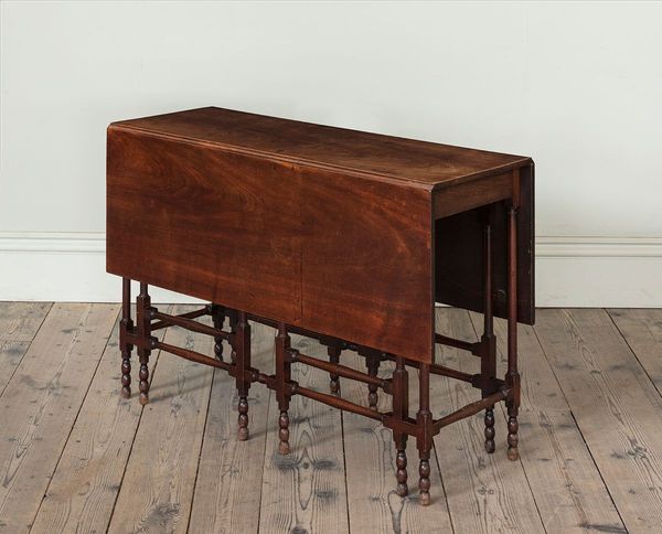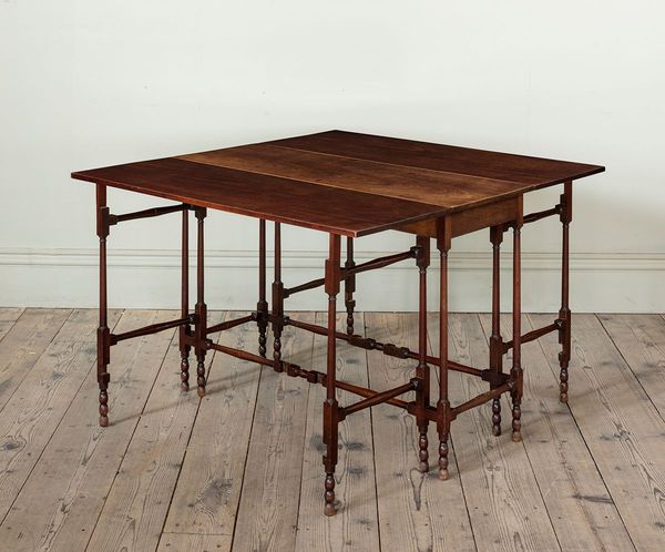 Of significant scale; the rectangular top with drop leaves, above turned column double gate supports united by knopped stretchers, on incised bobbin feet