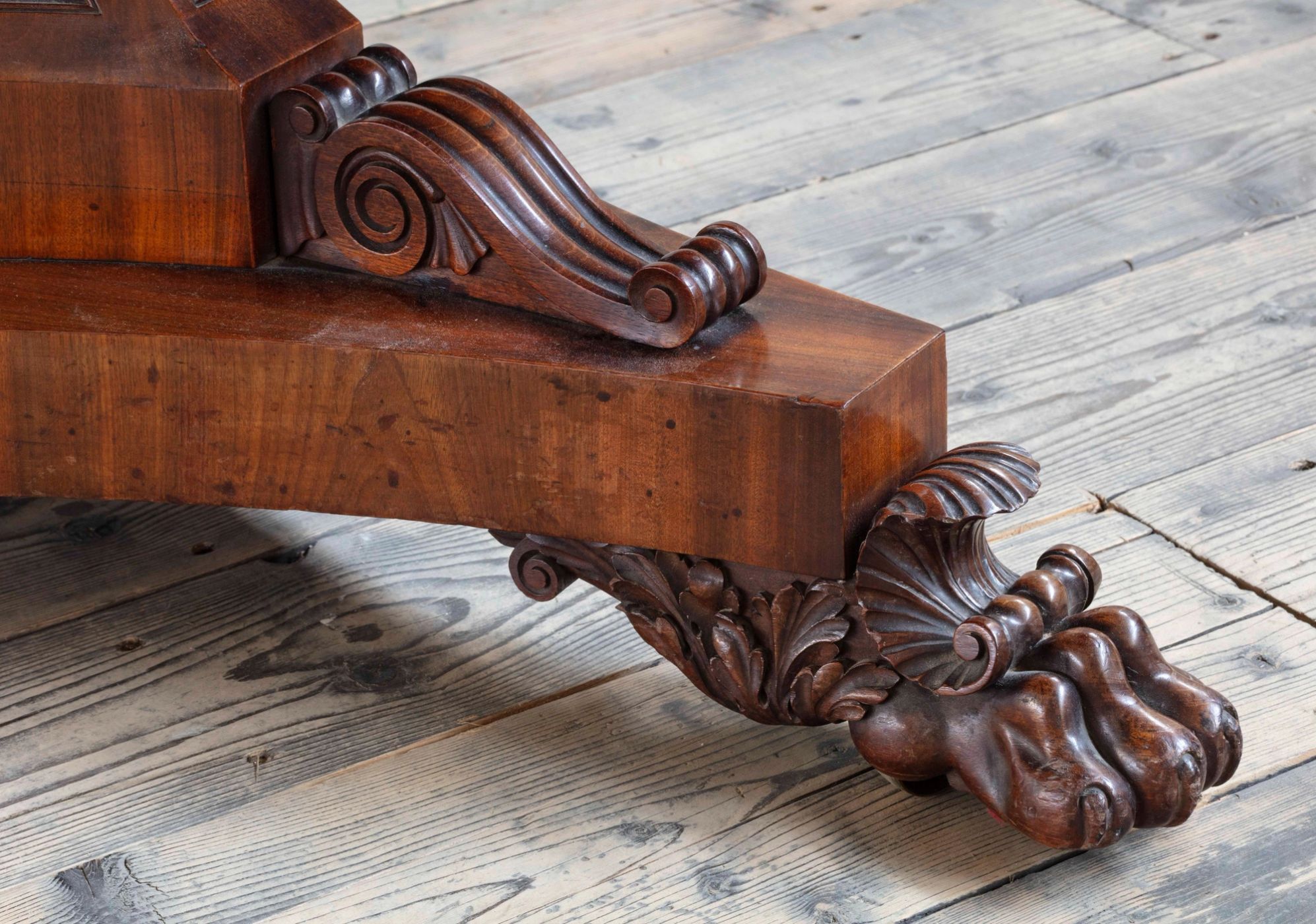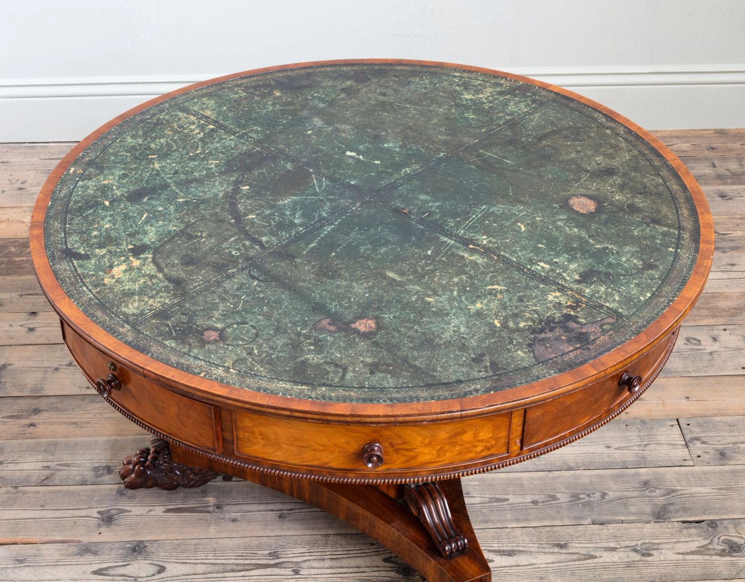 The revolving top with a tooled green leather insert, fitted with short drawers above split beading, on a panelled triform pedestal, the plinth with bold paw feet.