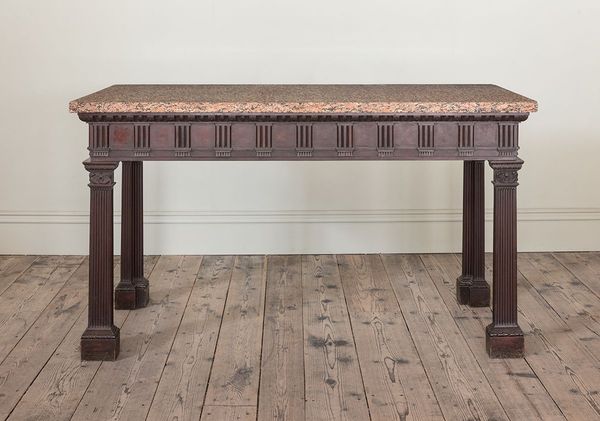 The fine Doric columns forming the legs on this table were perhaps inspired by such classical masterpieces as the Bath of Diocletian and the Temple of Minerva, both of which were described in Sir William Chambers’ landmark publication A Treatise on Civil Architecture of 1759. Chambers was later the architectural advisor to King George III, and these tables have all the hallmarks of pieces designed by a talented architect for a the home of a connoisseur who would have appreciated and understood the classical orders and been interested in applying them to home decoration rather than merely exterior architectural detail. A drawing now housed at the Soane Museum, draws enormous visual comparisons with the line and form of the table, and illustrates architectural layouts for Chambers’ greatest surviving project – Somerset House. This drawing is a design for a window, described as “Detail of Window of Treasury Remembrancer’s Office, Front Block, facing Quadrangle”, and is included in the imagery here.