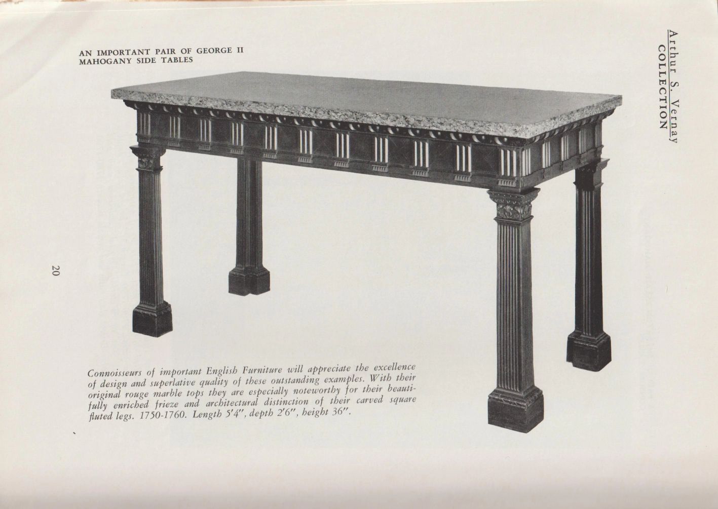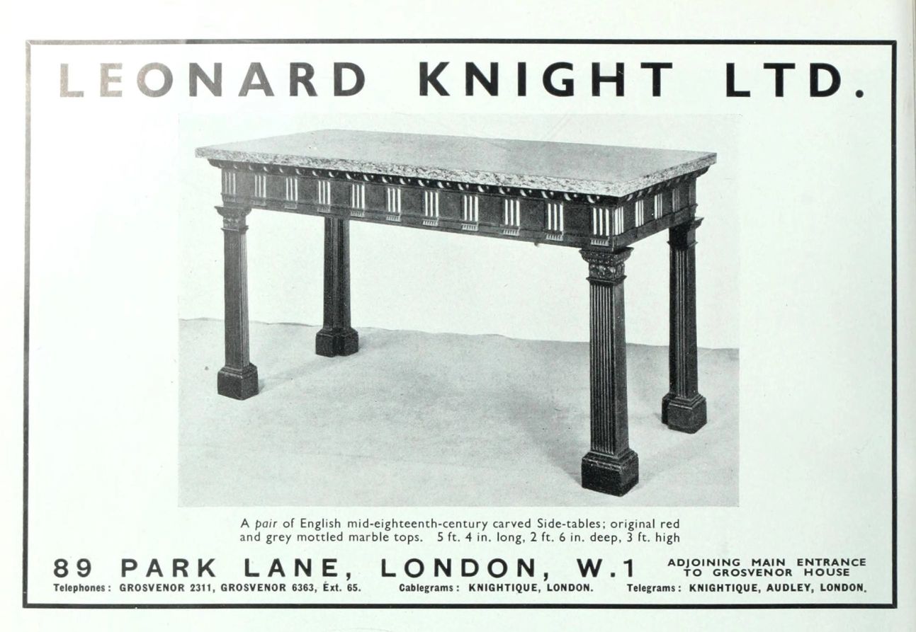Our tables have been illustrated by their past owners in prominent publications. When owned by Leonard Knight, a great London dealer based in Park Lane, the tables were chosen for illustration in Connoisseur magazine in the June 1949 issue. Knight singled out the originality of the fine tops and it is wonderful that they have survived in such good condition and are still on the tables more than 70 years later. It was presumably Leonard Knight who sold the tables to Arthur Vernay inc., and in 1951 as they were then advertised in the firm’s Spring Catalogue for that year. Describing them as “an important pair of George II mahogany side tables”, the Vernay firm’s statement that “connoisseurs of important English furniture will appreciate the excellence of design and superlative quality of these outstanding examples” is as accurate today as when the catalogue was published.