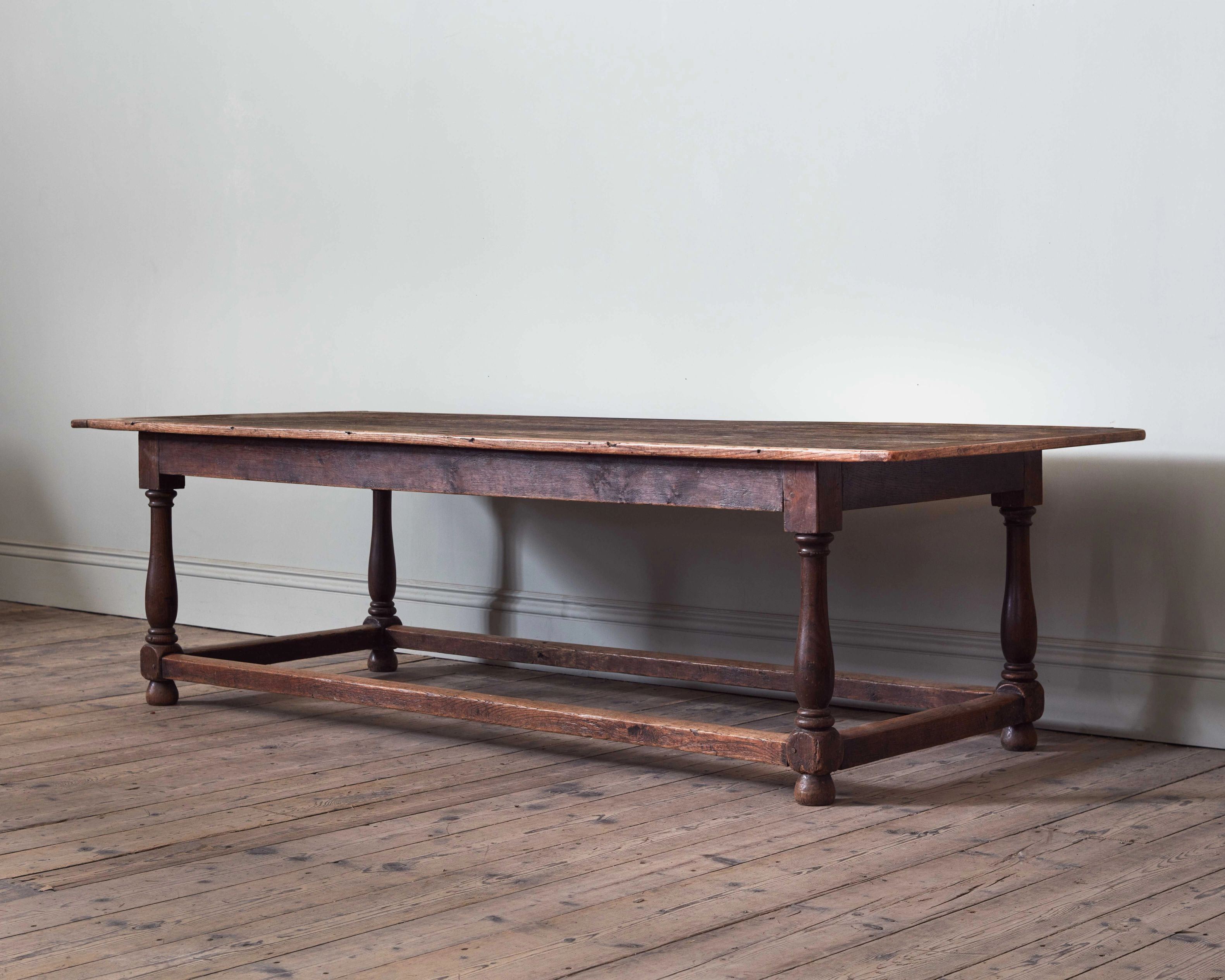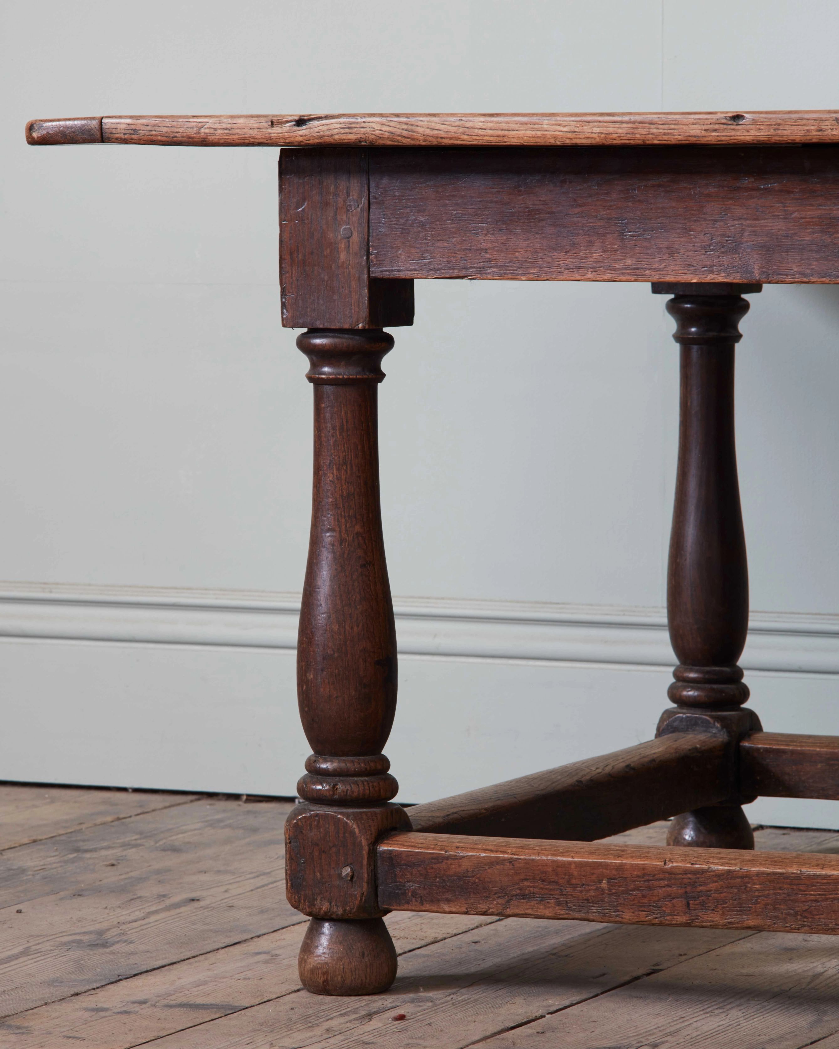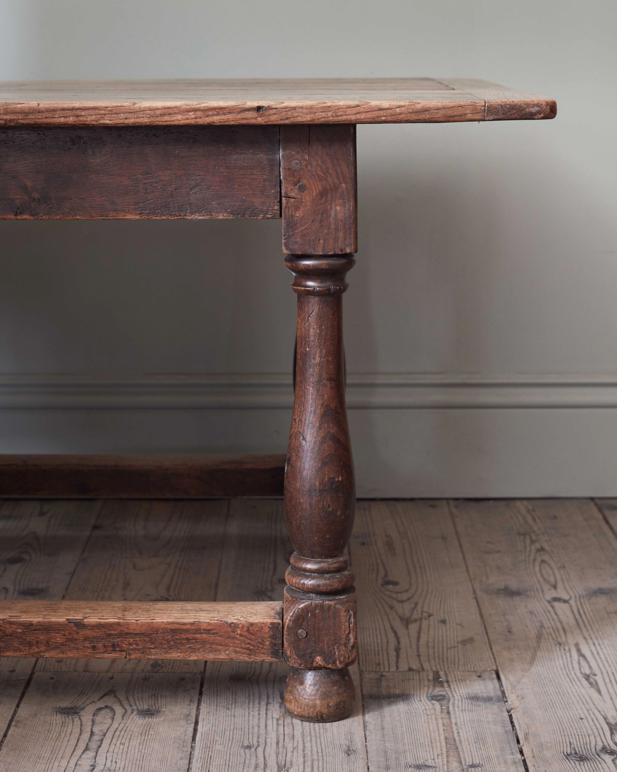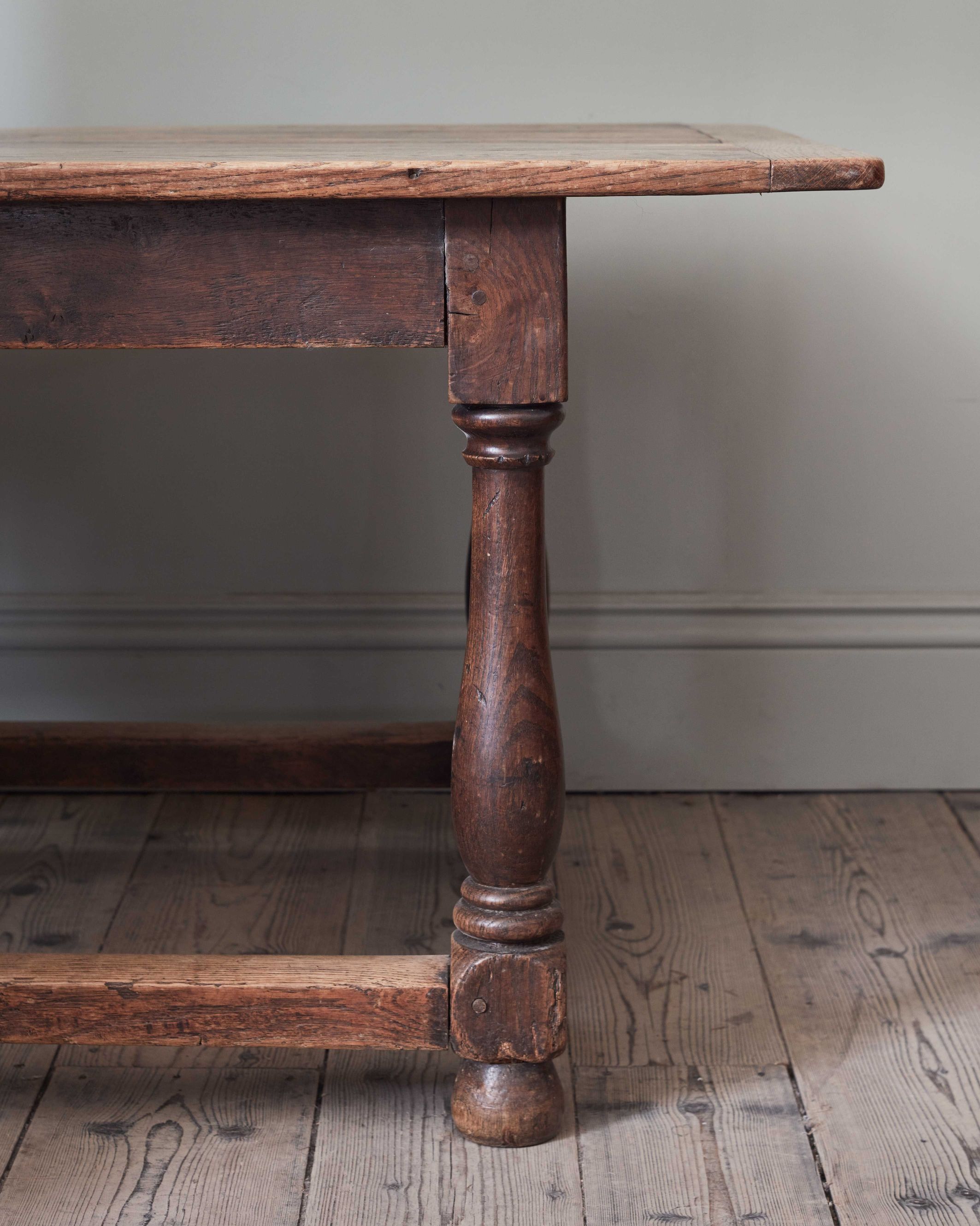 With exceptionally coloured plank top, with a gentle soft patina to the oak surface, on turned legs.