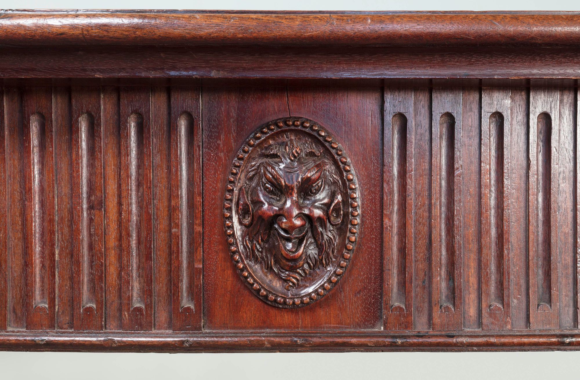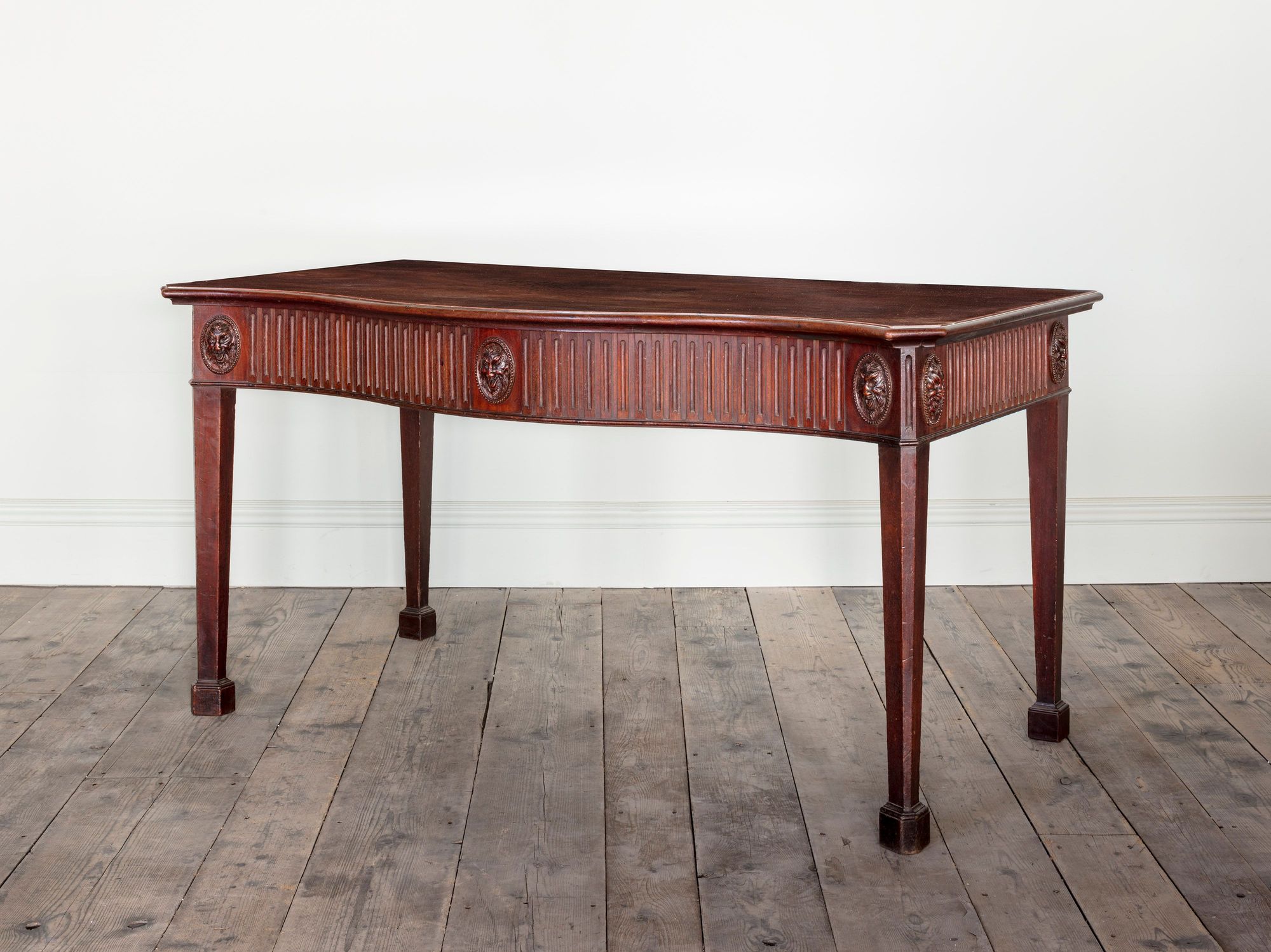 The well figured mahogany top above a fluted frieze, with carved oval satyr masks, resting on square chamfered legs and block feet.