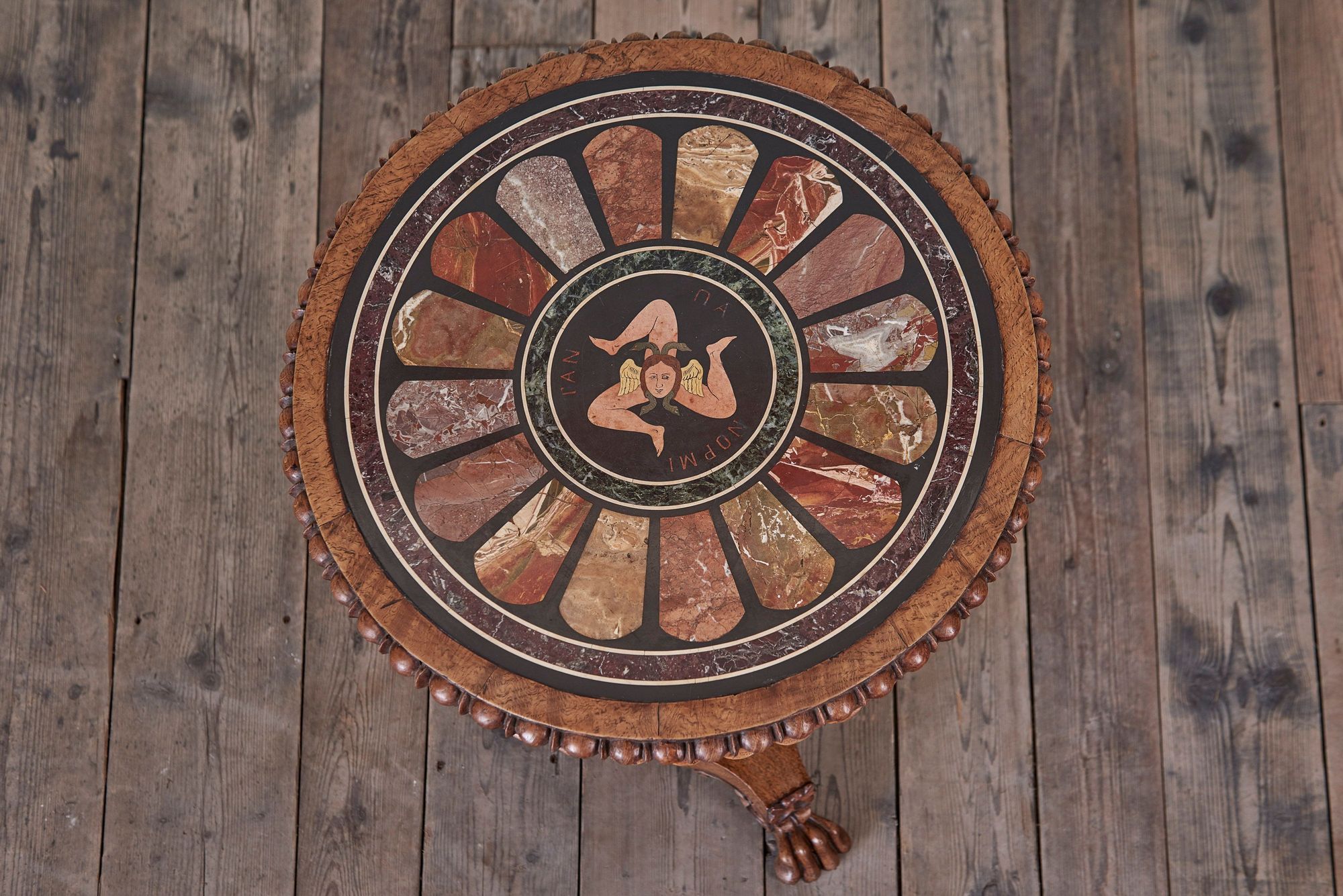 The circular top inlaid with a variety of intricate marble specimens, with a central inlaid ‘Trinacria’ tablet resting within a burr oak band, inside beaded edge, above a lotus leaf frieze on a carved central column, with boldly carved lion’s paw feet.