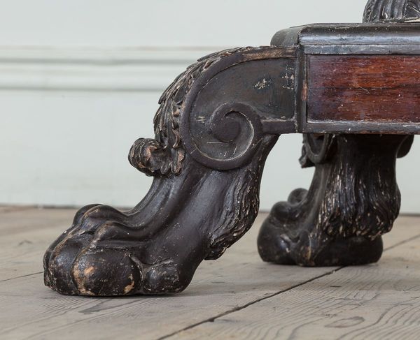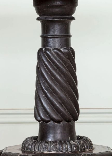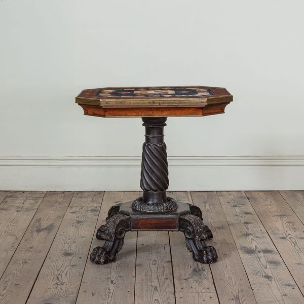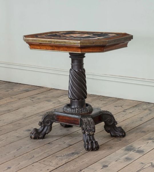 With inset pietra dura top with intricately cut brass inlaid stringing, on ebonised column support with handsomely carved lion paw feet.