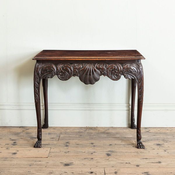The rectangular top with rounded corners and moulded edge above a shaped frieze carved with scrolling acanthus,cross hatching, centered by a large scallop shell standing on four acanthus carved cabriole legs terminating in paw feet with carved fetlock.