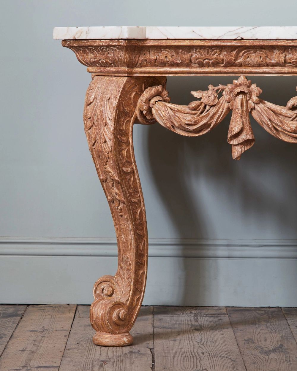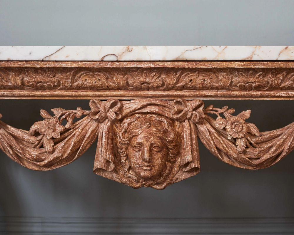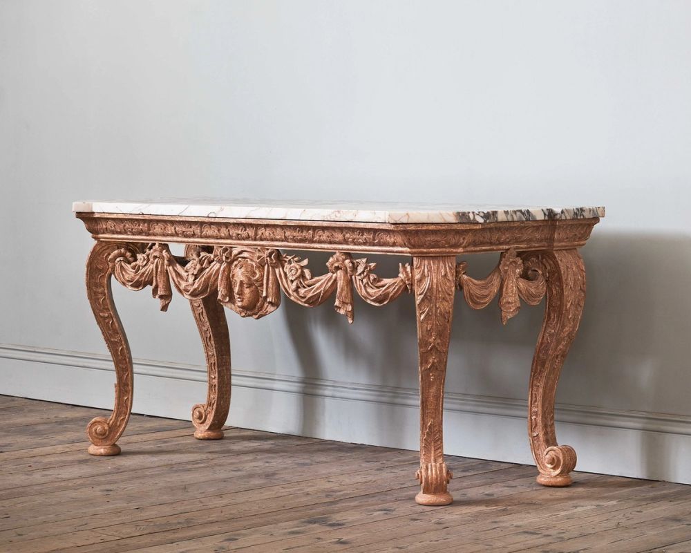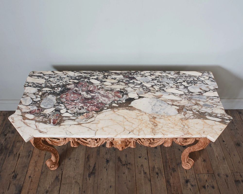 Carefully dry stripped to reveal the soft lustre of the original gilt surface, the table has exceptional carving to the shaped frieze, on wonderfully drawn cabriole acanthus carved legs, with draped and foliate swags, and central female mask. The later (but 19th Century) highly figured breche violette marble top, with adaptations in size.