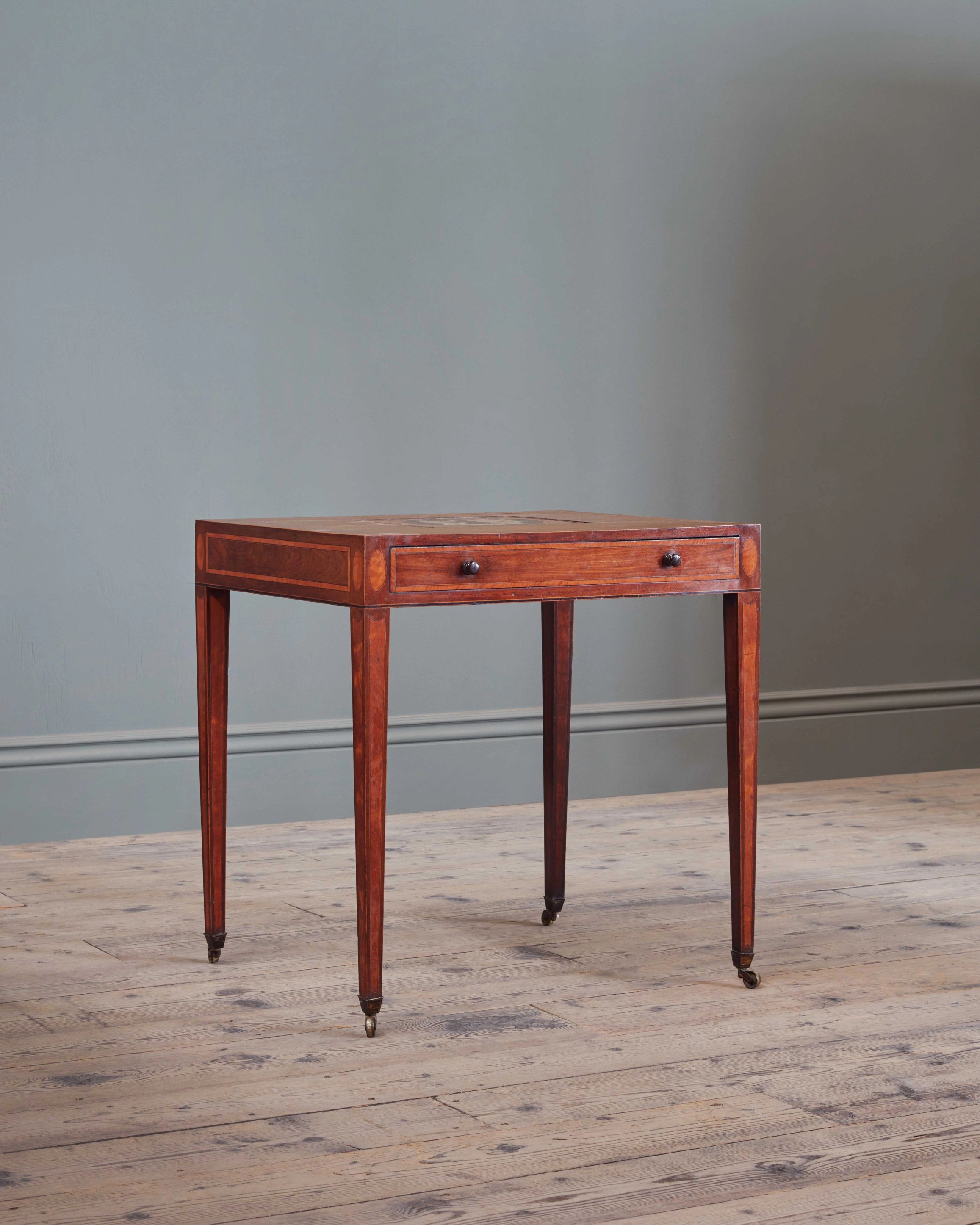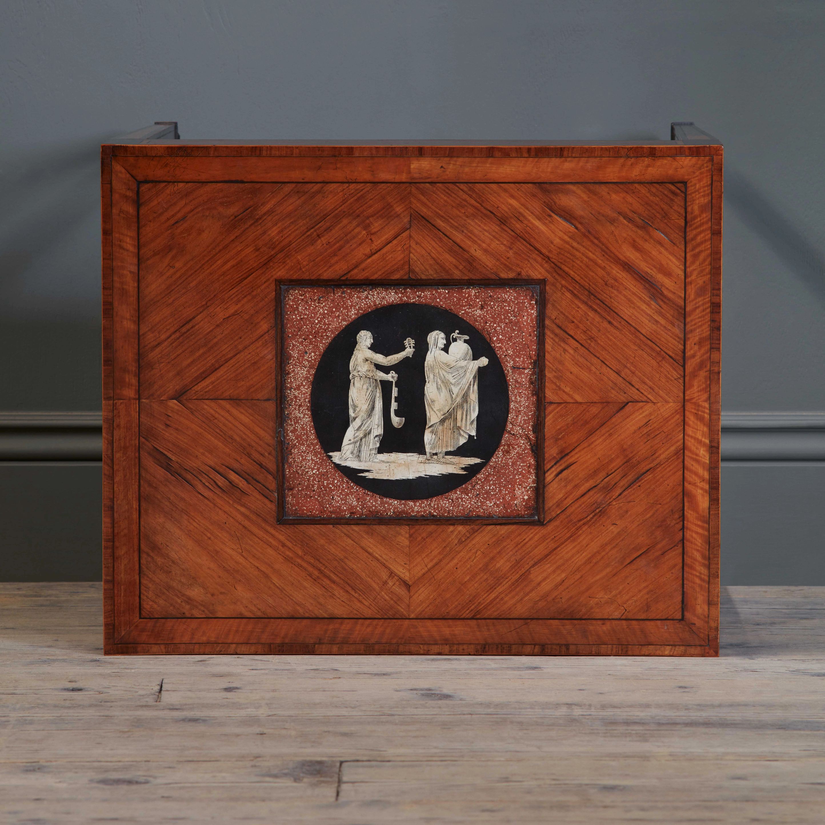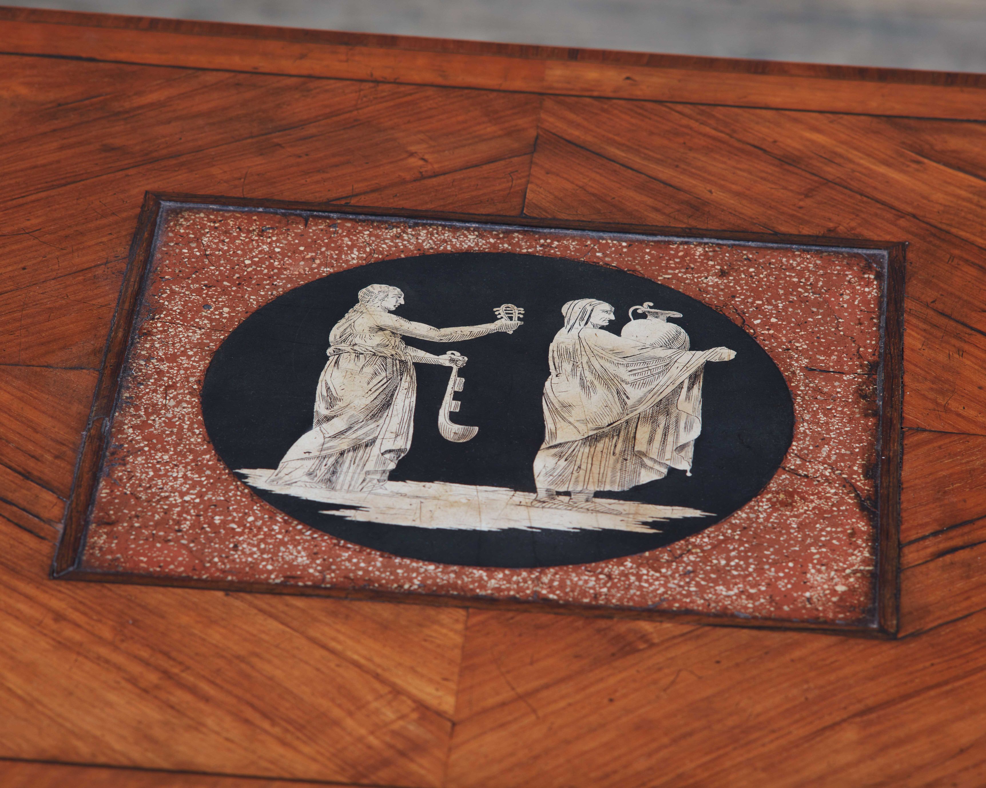English, c.1785. Incorporating exotic timbers of Kingwood, satinwood, Goncalo alves and mahogany, with a long drawer, tapering legs, and brass casters; the scagliola panel of figures on a porphyry background, would have been bought back from the Grand Tour in the 18th century. As was the practice, this piece of furniture was specifically made to incorporate the panel.